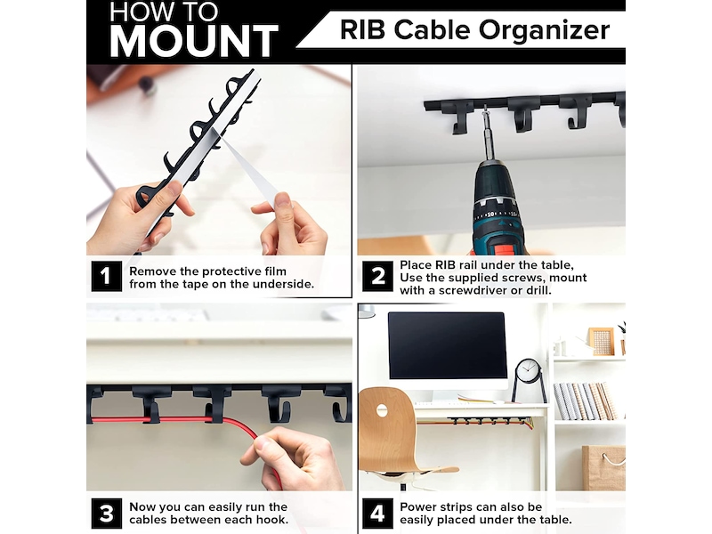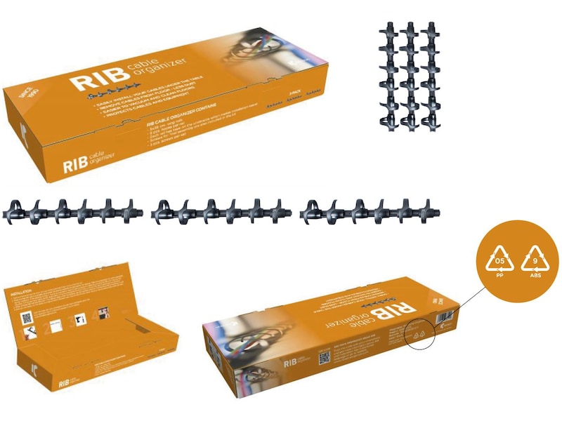 RIB Kabelholder er et kabelophæng fra Kenson, der nemt og effektivt skjuler alle kabler under skrivebordet. Skruer og dobbeltsidet tape medfølger i posen.