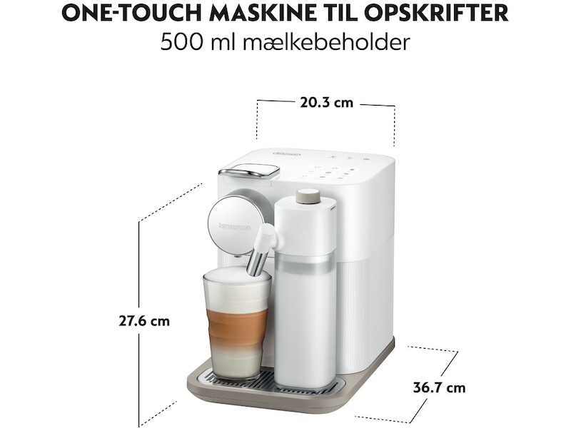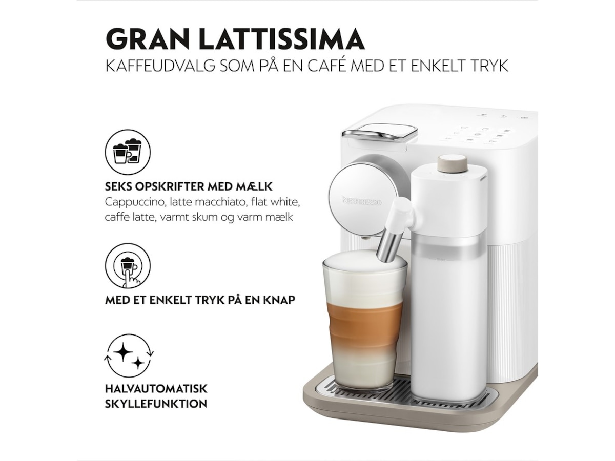 Nespresso Gran Lattissima kaffemaskine fra DeLonghi, White One-touch mælkesystem: et innovativt mælkesystem, hvor alle dine kaffe- og mælkeopskrifter er tilgængelige med et tryk på en knap.