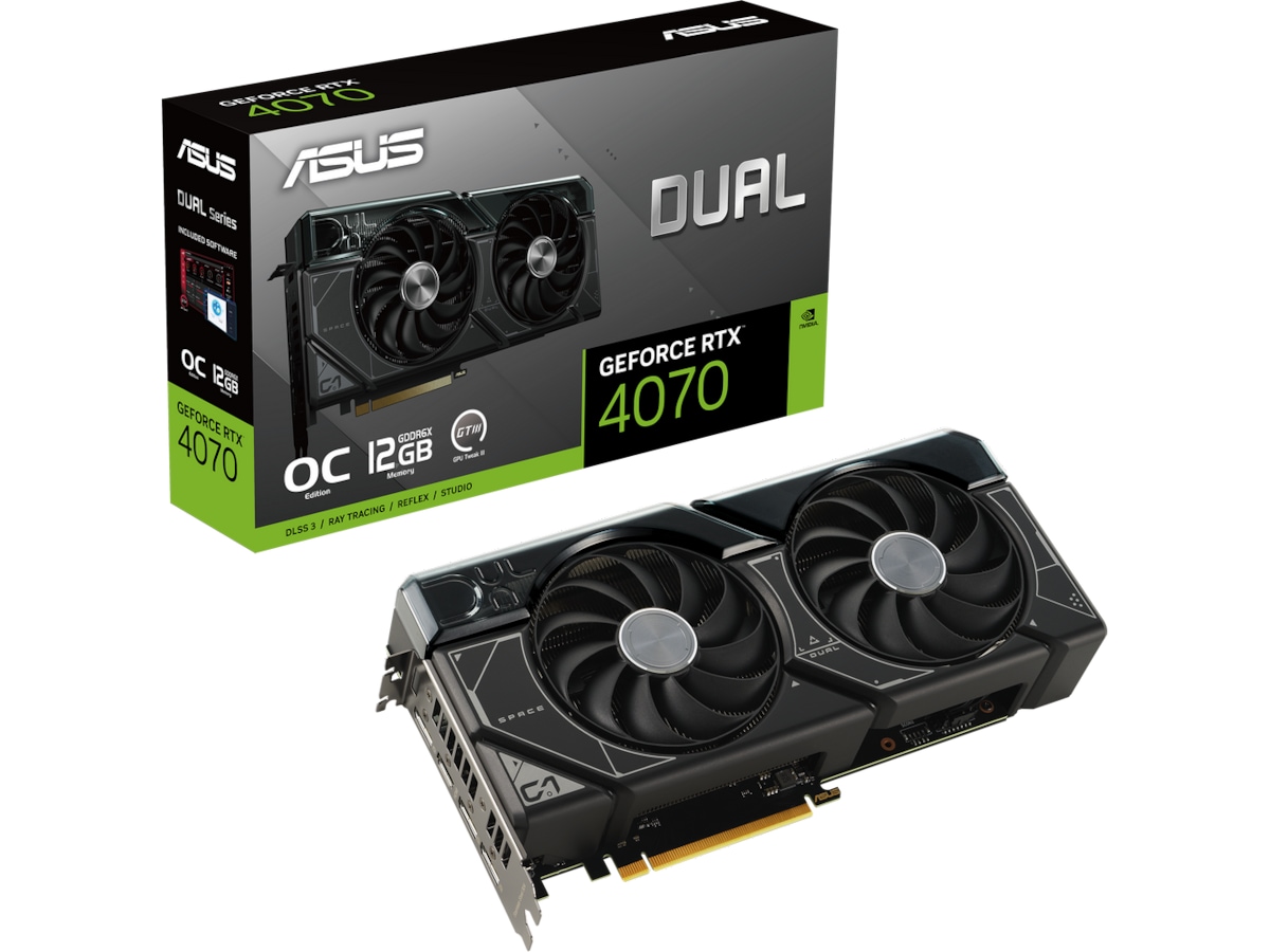 ASUS Dual GeForce RTX™ 4070 12 GB GDDR6X med to kraftfulde Axial-tech fans og et 2,56-slot design for bred kompatibilitet