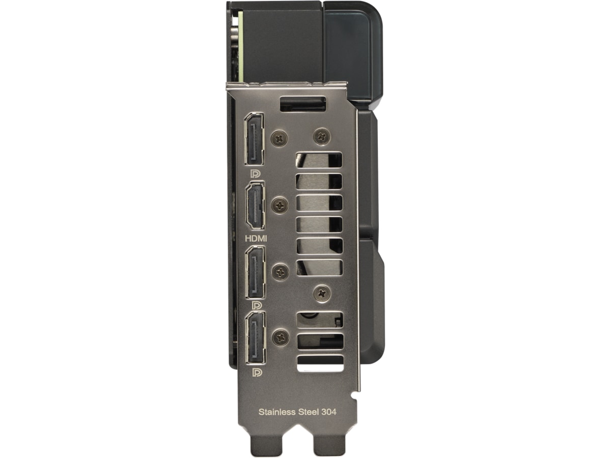 PCB'en er forstærket med en aluminiumsbagplade, der tilføjer strukturel stivhed, hjælper med at forhindre bøjning og beskytter komponenter og trace-pathways mod skader. Bagsiden har en bred åbning, der tillader varm luft at slippe ud i retning mod chassisets udstødningsventilatorer i stedet for at blive genbrugt tilbage i GPU-køleren.