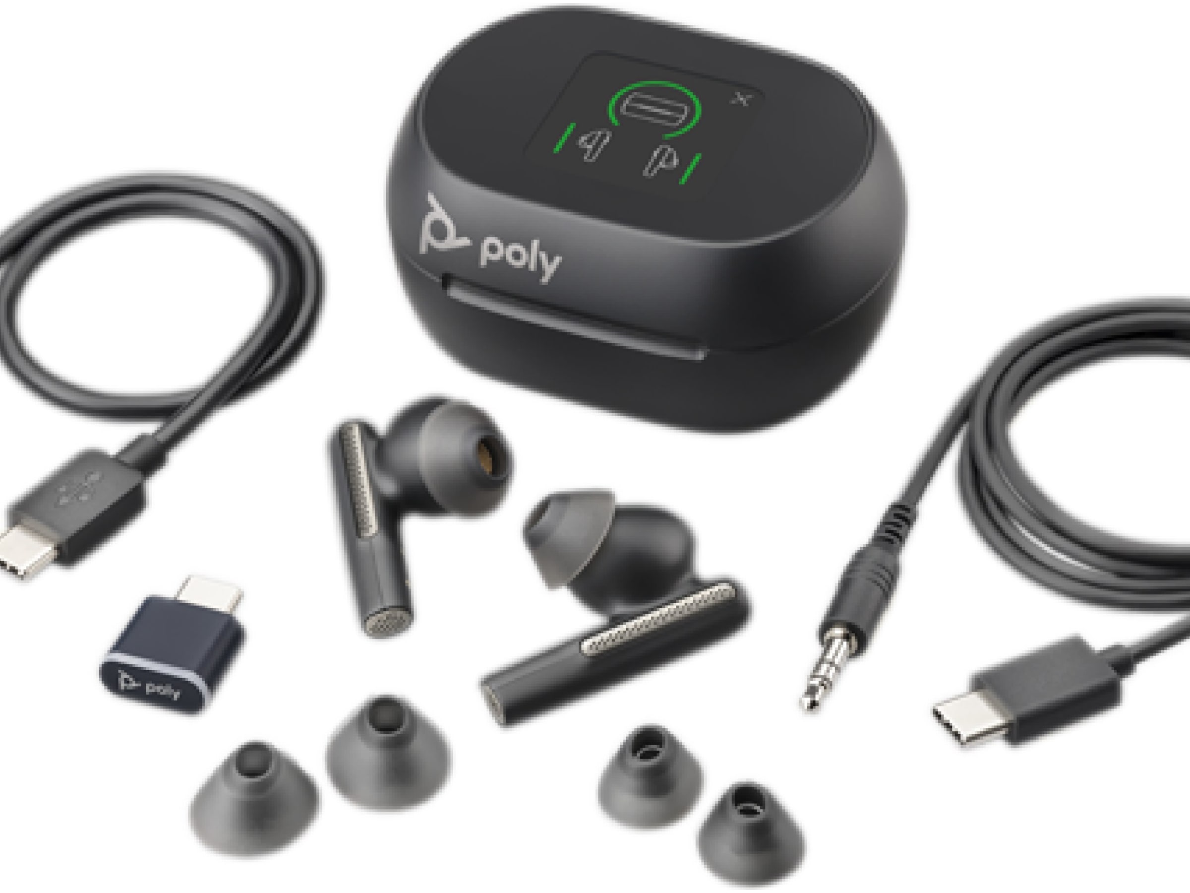 - Konfigurer og styr nemt dine øretelefoner ved hjælp af touchscreen-opladningsetuiet (Voyager Free 60+ UC)