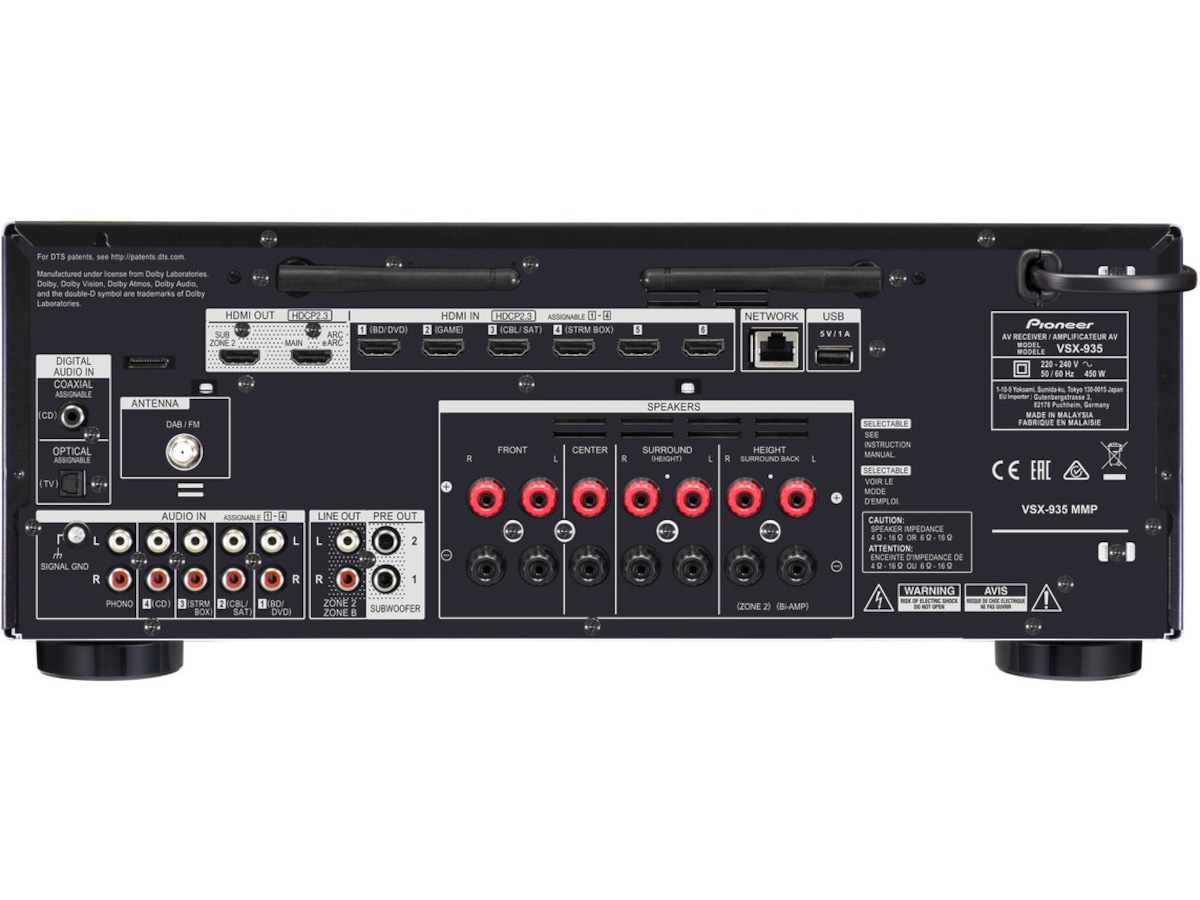 Du kan stadig nyde lignende effekter af Dolby Atmos Height Virtualizer og DTS Virtual:X selv uden højde- eller surroundhøjttalere. Med Ultra HD, HDR10, HLG og Dolby Vision™ passerer igennem, der giver evigt livagtige billeder. Derudover understøtter VSX-935 HDMI 2.1*1 til 8K, VRR, ALLM, QFT-gennemgang til næste generations video/gaming med HDCP 2.3. Du kan streame sange fra forskellige kilder via musikserver, Bluetooth®, DTS Play-Fi, Sonos-system og Apple AirPlay 2. Den er Roon-testet, hvilket gør det nemt at streame musik fra AV-udstyr. Andre højdepunkter inkluderer Powered Zone 2-funktion med en dedikeret DAC, personlige forudindstillede knapper, 2 HDMI-udgange, og den fungerer med Alexa/Ok Google til stemmestyring.
