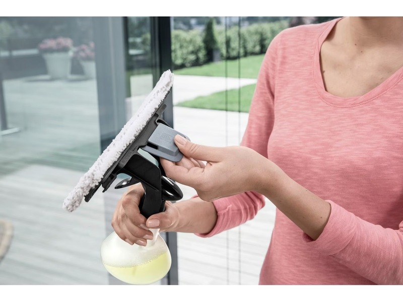 Pakke med Kärcher WV 2 Plus N Vinduesvasker og Kärcher WV mikrofiberklud udendørs