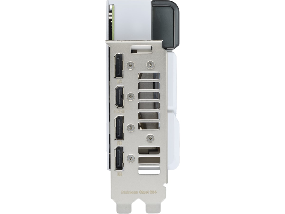 The PCB is reinforced by an aluminum backplate that adds structural rigidity, helping to prevent flex and protect components and trace pathways from damage. The rear features a wide vent that allows hot air to escape towards chassis exhaust fans instead of being recycled back into the GPU cooler.