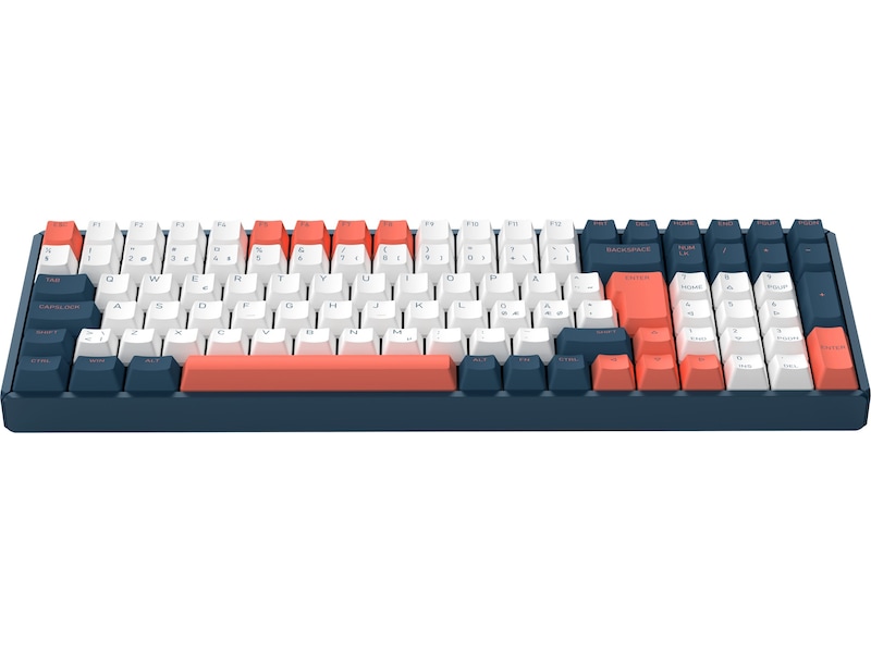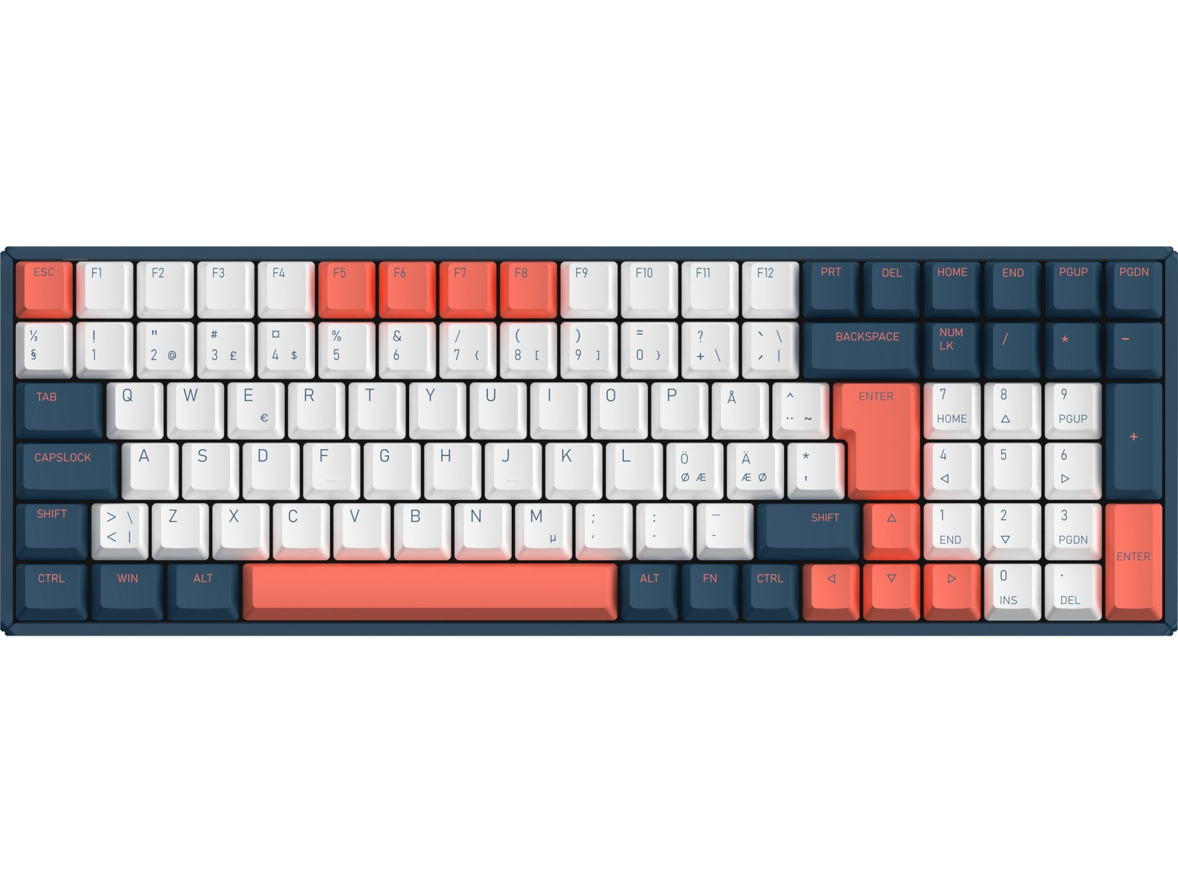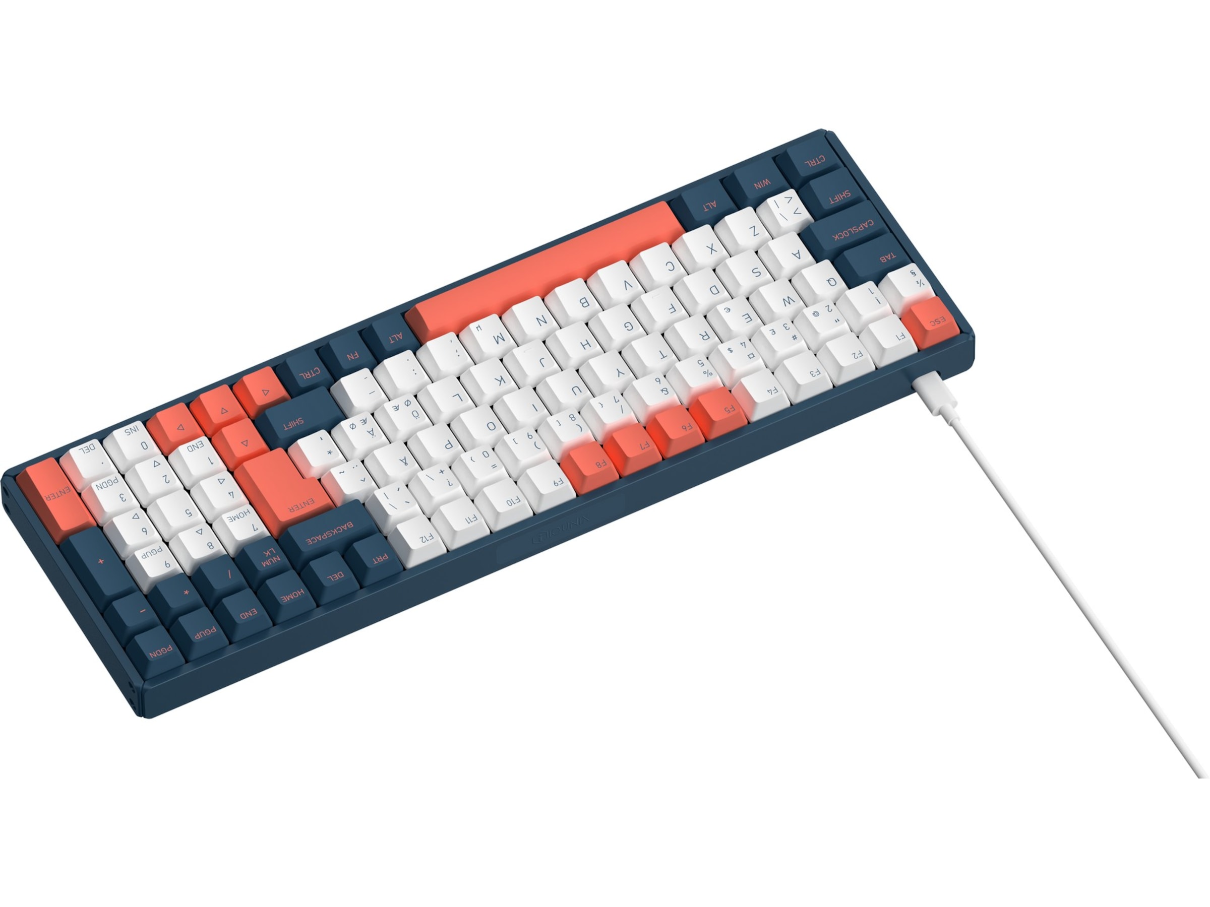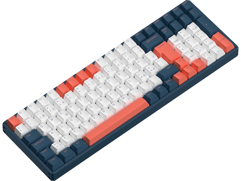 Kompakt layout med 100 taster. Det er et "fuld størrelse" tastatur, der indeholder et numerisk tastatur, men som frigør skrivebordsplads. Hvad mere er, lægger den vægt på ergonomisk design, der danner en vinkel på 6° med skrivebordet, der matcher krumningen af tastehætterne og buerne på menneskelige hænder, hvilket kan reducere håndleddets belastning og træthed og give en mere behagelig skriveoplevelse.