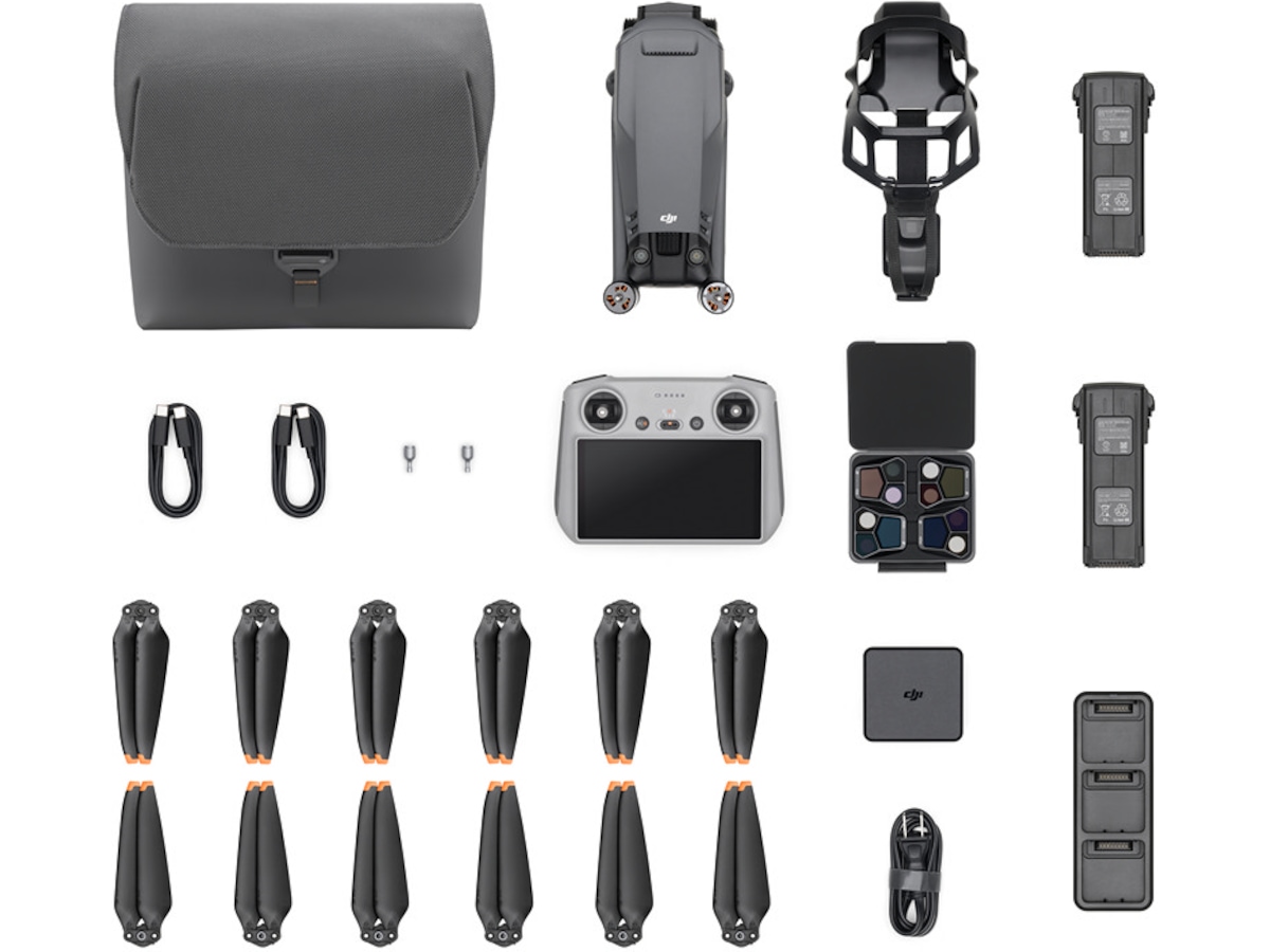 Pakkeindhold Fjernstyring, Strømkabel, 3 intelligente flyvebatterier, Opbevaringsdække, 6 par lavstøjspropeller, ND-filtersæt (ND8/16/32/64), Skuldertaske, 100 W batteri-opladningshub, USB-C kabel, Strømadapter, Par af reservekontrolpinde
