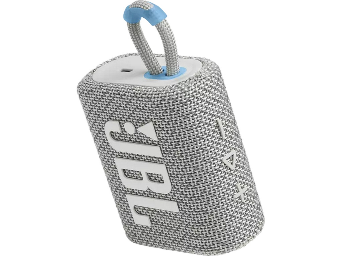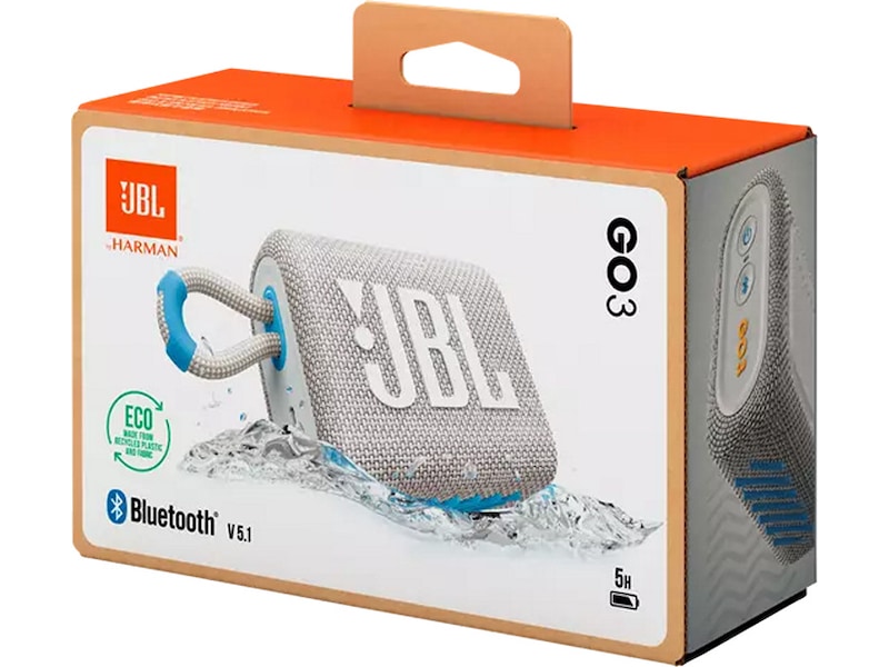 Nyt innovativt, miljøvenligt design – samme rige JBL Original Pro Sound-ydeevne. JBL Go 3 Eco er fremstillet ved at bruge op til 90 % PCR (post-consumer recycled) plastik med 100 % genbrugt stof på højttalergrillen, hvilket reducerer mængden af ny plastik, der bruges, samtidig med at produktets samlede CO2-fodaftryk. Den kommer også i bæredygtig emballage lavet af FSC-certificeret papir trykt med sojablæk.