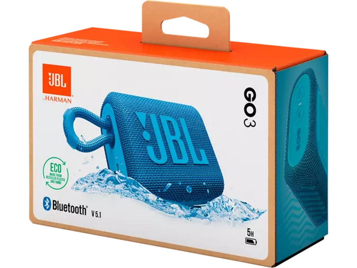 Nyt innovativt, miljøvenligt design – samme rige JBL Original Pro Sound-ydeevne. JBL Go 3 Eco er fremstillet ved at bruge op til 90 % PCR (post-consumer recycled) plastik med 100 % genbrugt stof på højttalergrillen, hvilket reducerer mængden af ny plastik, der bruges, samtidig med at produktets samlede CO2-fodaftryk. Den kommer også i bæredygtig emballage lavet af FSC-certificeret papir trykt med sojablæk.