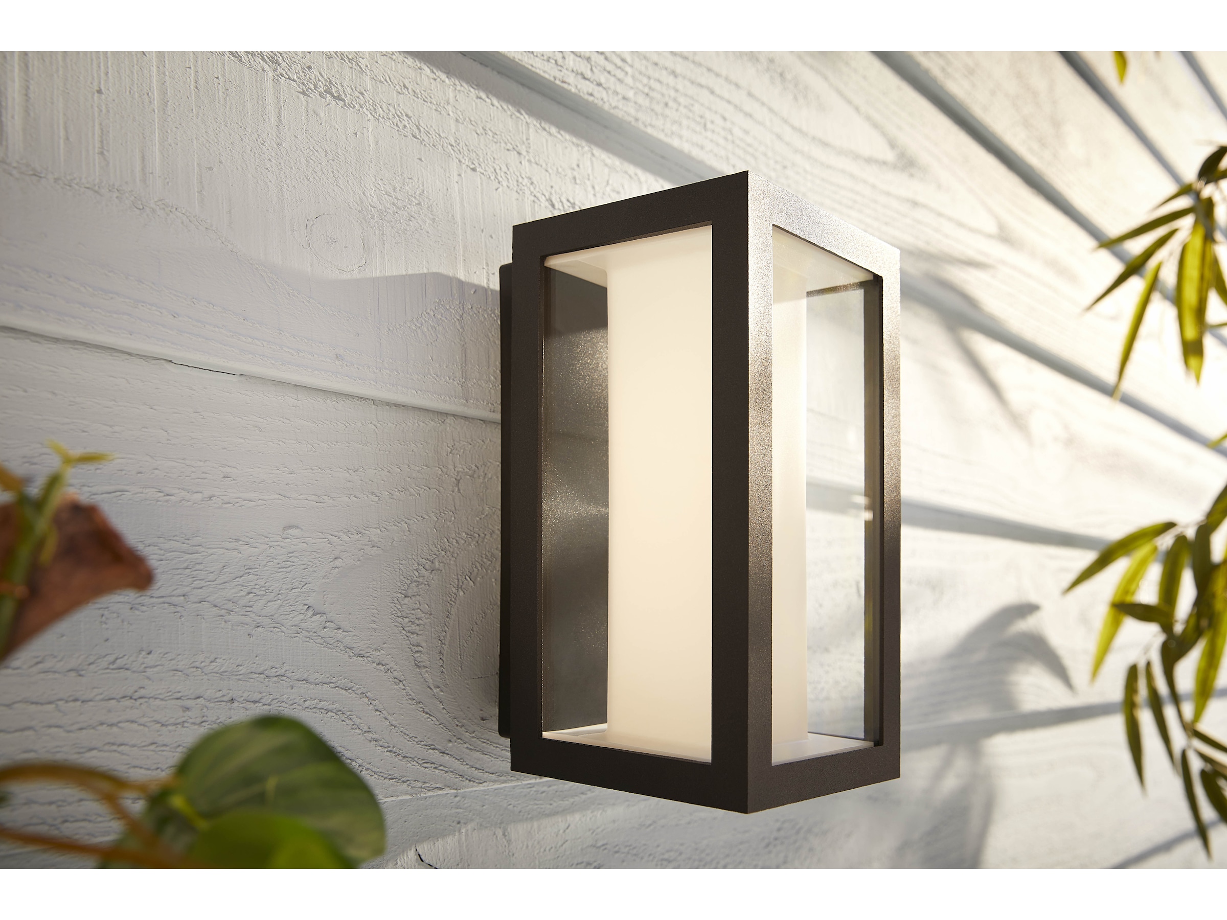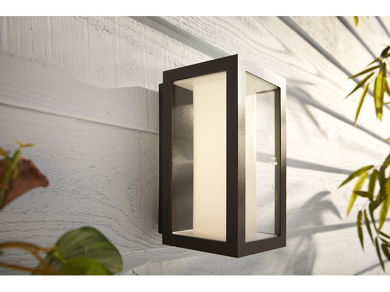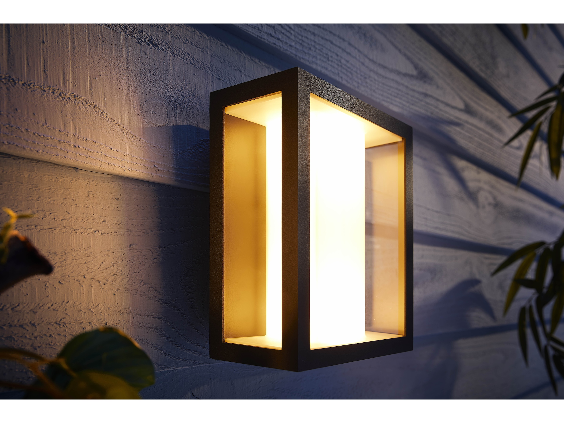 Denne væglampe passer perfekt til de fleste hjems udendørsområder med sit slanke og moderne design. Med White and color ambiance kan du skifte mellem 16 millioner farver og tilpasse din belysning til enhver lejlighed, hvad end du vil oplyse dit hjem på en mørk vinteraften eller skabe den helt rette atmosfære til en sommermiddag på terrassen. Brug funktionerne i Hue appen til at indstille timere, rutiner og lysscener, og styr din belysning fra hvor som helst i verden. Lampen kræver en Hue Bridge samt en fast installation med tilslutning til 220-240V.