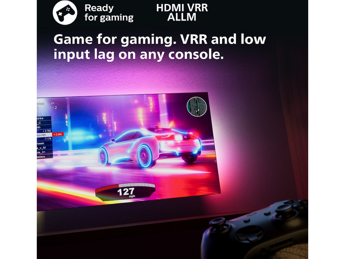 Med HDMI 2.1 får du det bedste ud af konsollen med hurtig spil og glat grafik. Med understøttelse af VRR og en lav latensindstilling, der automatisk aktiveres, når du tænder for konsollen. Ambilight-spiltilstand gør spændingen større.