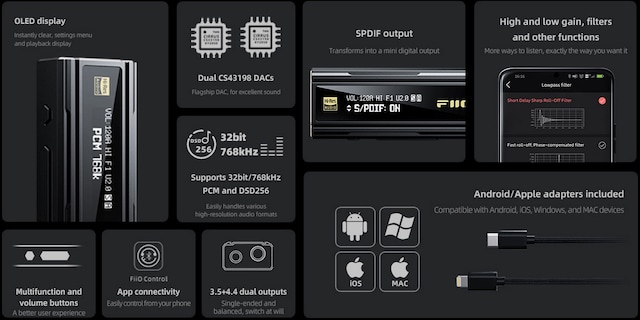 FiiO KA5 er flagskibet i KA-serien og bygger på succesen med KA3. Med dobbelt CS43192 DAC, understøttelse af 32bit/768 kHz PCM - 256 DSD og OLED-skærm, har du alt hvad du skal bruge for at opnå fremragende lyd fra din telefon, tablet, bærbare computer mm. OLED-skærmen gør det nemmere at justere indstillinger ved at bruge knapperne på siden af enheden. 3,5 mm output kan justeres til SPDIF output, hvis man ønsker at sende signalet videre til en DAC. Hvis du har brug for yderligere kontrol over enheden, kan du justere alt fra FiiO Control App til Android og IOS. Enheden understøtter også UAC 1.0.