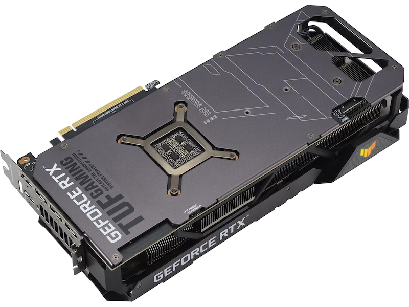 Det meste af bagsiden er skåret i en beskyttende metalbagplade, der gør sig bemærket med en bred udluftning. Udluftningen tillader, at varm luft slipper ud mod chassisets udstødningsventilatorer i stedet for at blive genanvendt tilbage i GPU-køleren.
