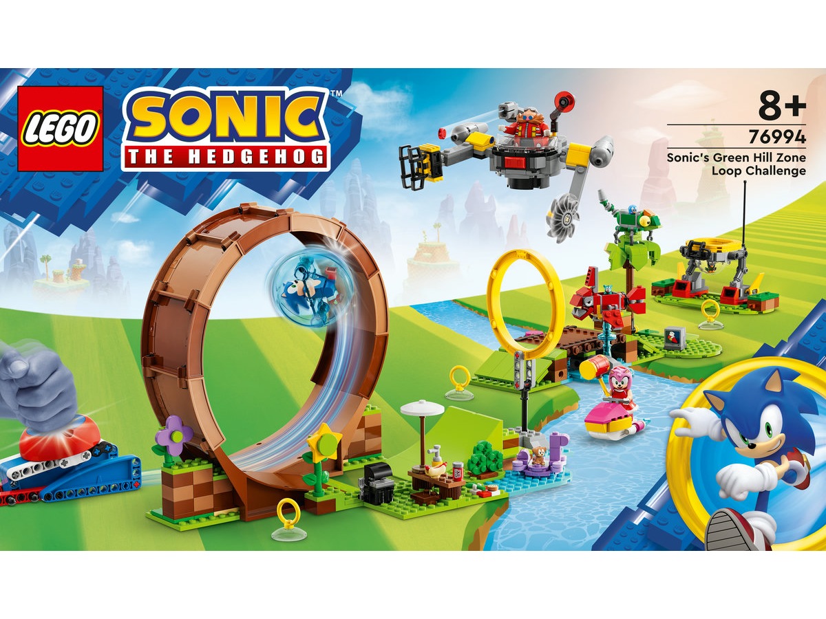 Oplev den ultimative udfordring for Sonic-fans med legesættet Sonics Green Hill Zone Loop-udfordring (76994). Det indeholder en fartkugle og en affyrer, der kan sende Sonic igennem banen på hans mission om at redde dyrene fra dr. Eggman og badnikkerne. Børn fra 8 år kan nyde udfordringen, når Sonic flyver gennem loopet og ringen, vælter dr. Eggmans mech-robot og befrier dyrene, der er fanget indeni. Derefter kan de hjælpe Amy, når hun bruger sin vandscooter og sætter fælder for at besejre badnikkerne Chopper og Newtron.