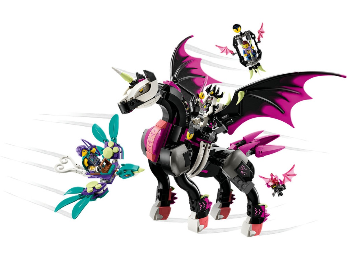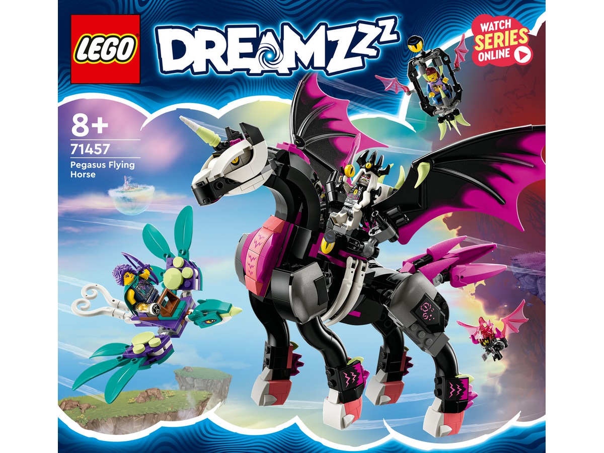 Med LEGO® DREAMZzz™ Pegasus, den Flyvende Hest (71457) byggelegesæt, kan børn fra otte år og opefter flyve væk til drømmenes verden. Baseret på tv-serien følger sættet Zoey, da hun redder sin veninde Nova, som er blevet fanget af mareridtsvæsenet Susan på sin flyvende hest, Pegasus! Med historiedrevne byggeinstruktioner kan børn deltage i actionfyldt leg og vælge, hvad Zoey vil gøre.
