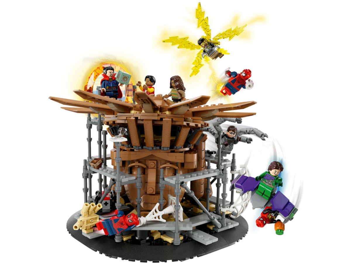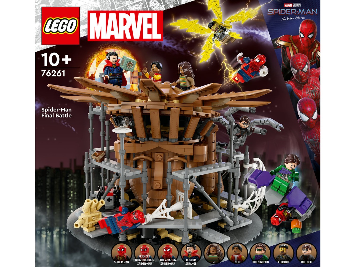 Dette 360°-sæt indeholder et spændende udvalg af LEGO Marvel-minifigurer, inklusive tre versioner af Spider-Man: den venlige Spider-Man (Tobey Maguire), den spektakulære Spider-Man (Andrew Garfield) og Spider-Man (Tom Holland). Sættet indeholder også minifigurer af Electro, Doctor Strange, Green Goblin, Ned, MJ og Doc Ock og masser af elementer for maksimal leg og visning, inklusive tre minifigurholdere til action i luften, et aftageligt tag, der afslører Sandman's hånd, en Flip-up bagklap til en portal og et blødt mesh-element, der kan foldes rundt om minifigurer. Bygherrer kan have ekstra digital sjov med den interaktive LEGO Builder-app, hvor de kan zoome og rotere sæt i 3D og spore deres fremskridt.