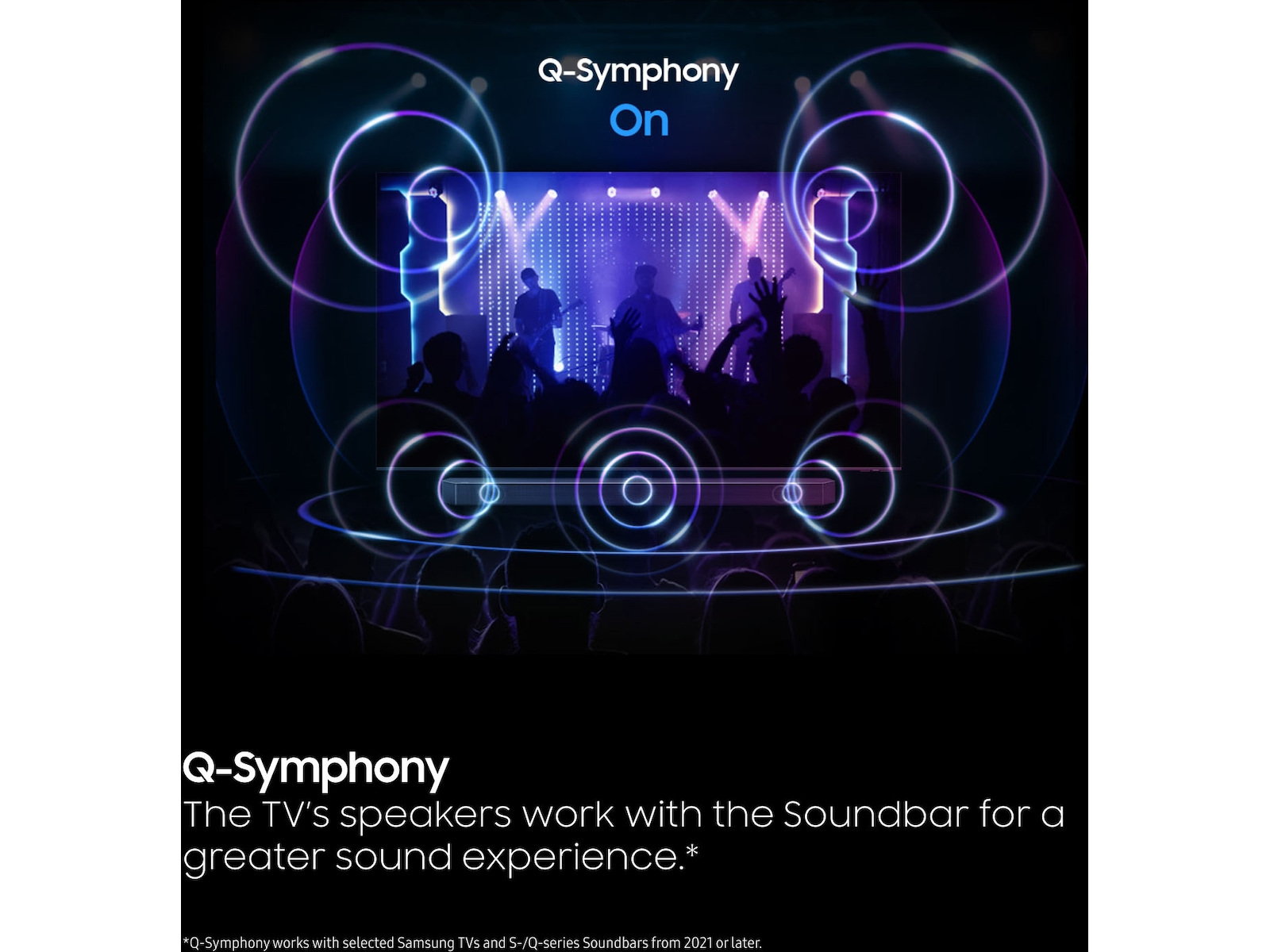 Q-Symphony leverer tilpasset lyd i hver kanal gennem både tv'ets og soundbarens front-, side- og opadvendte højttalere for en komplet akustisk oplevelse.