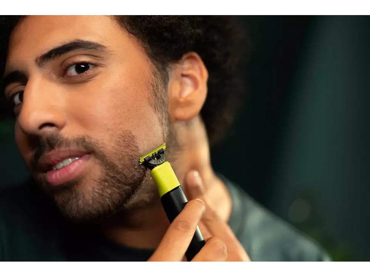OneBlade følger ansigtets konturer, så du nemt og komfortabelt kan barbere alle områder. Brug det dobbeltsidede knivblad til at forme kanterne og skabe rene linjer ved at flytte knivbladet i en hvilken som helst retning.