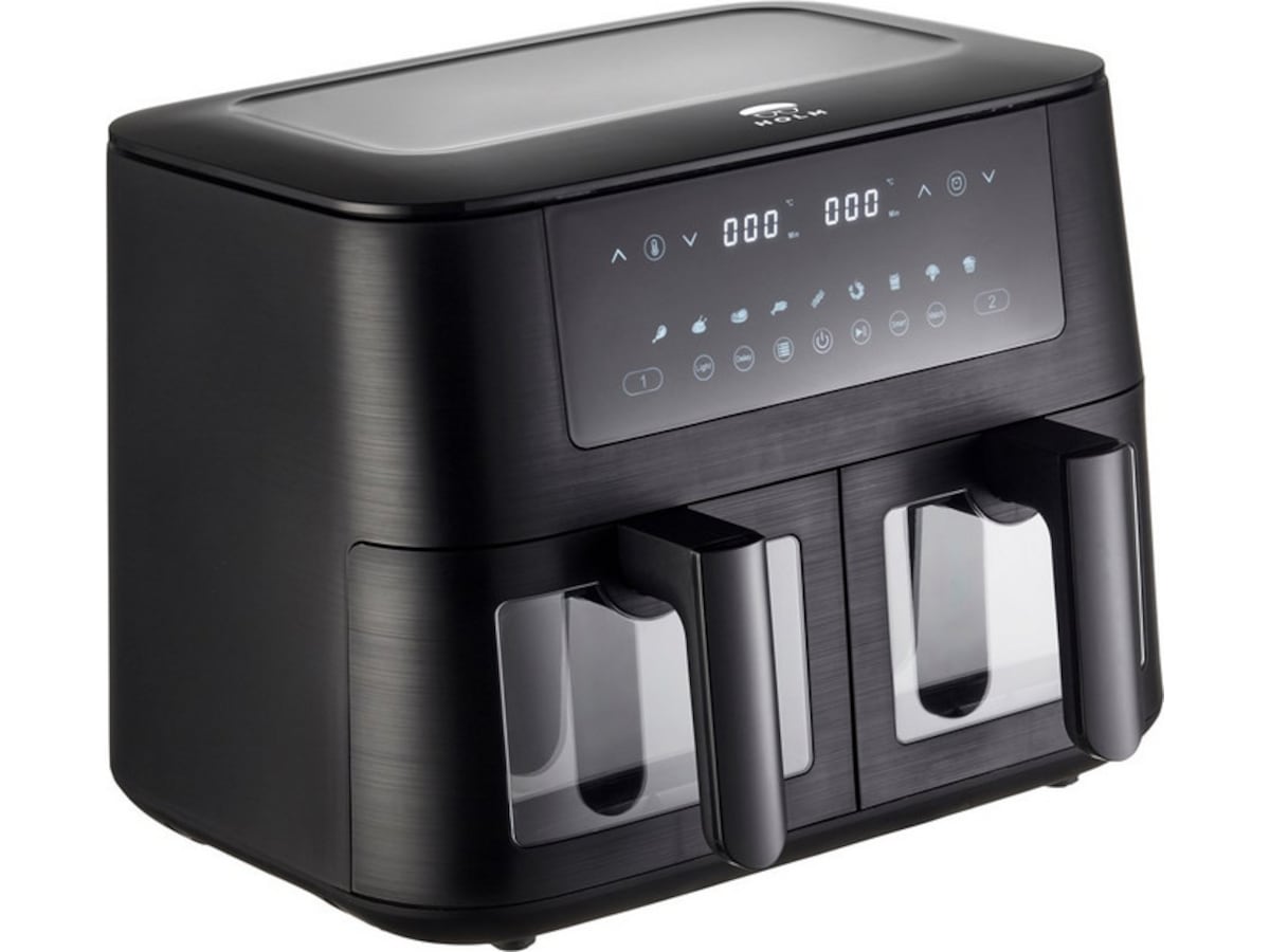 Denne airfryer er også udstyret med et digitalt display, auto-off og overophedningsbeskyttelse. Dobbelt op madlavning. Separat digital temperatur- og timerstyring. Automatisk slukning, når døren er åben. 3040W. Dele, der tåler opvaskemaskine.