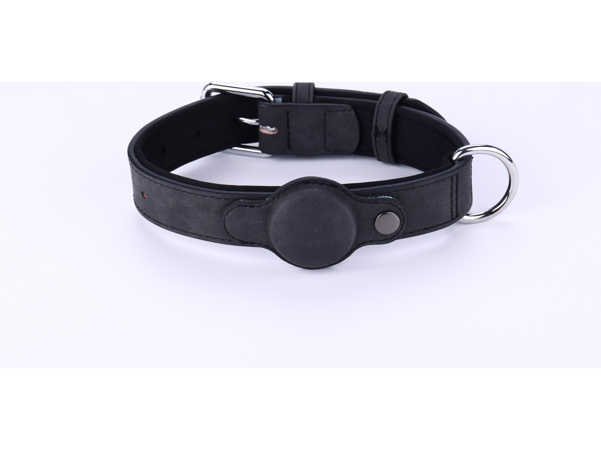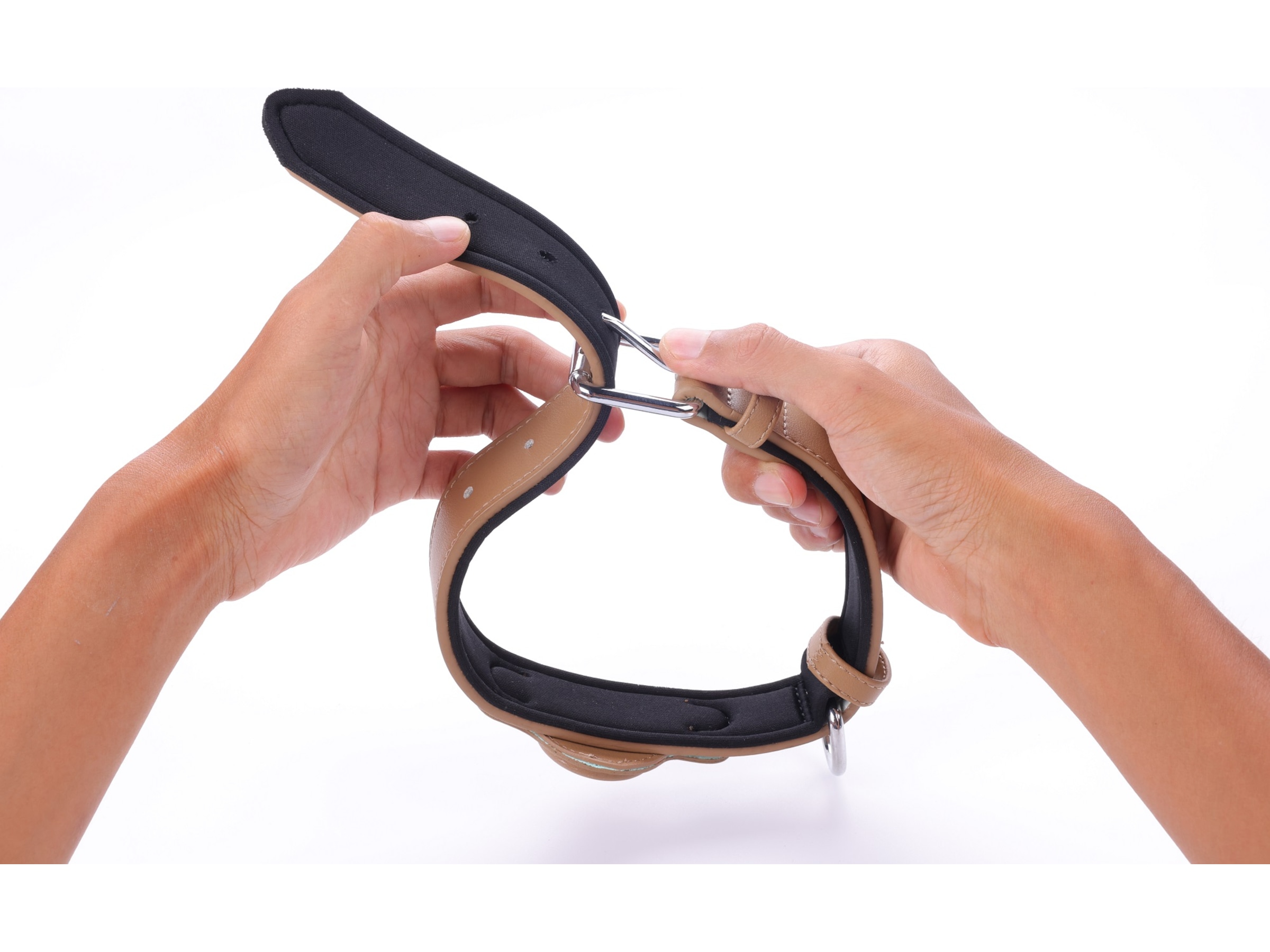 Halsbåndet er lavet af meget slidstærkt vegansk læder og er desuden foret med blødt materiale for at beskytte kæledyrets hals mod gnidninger.