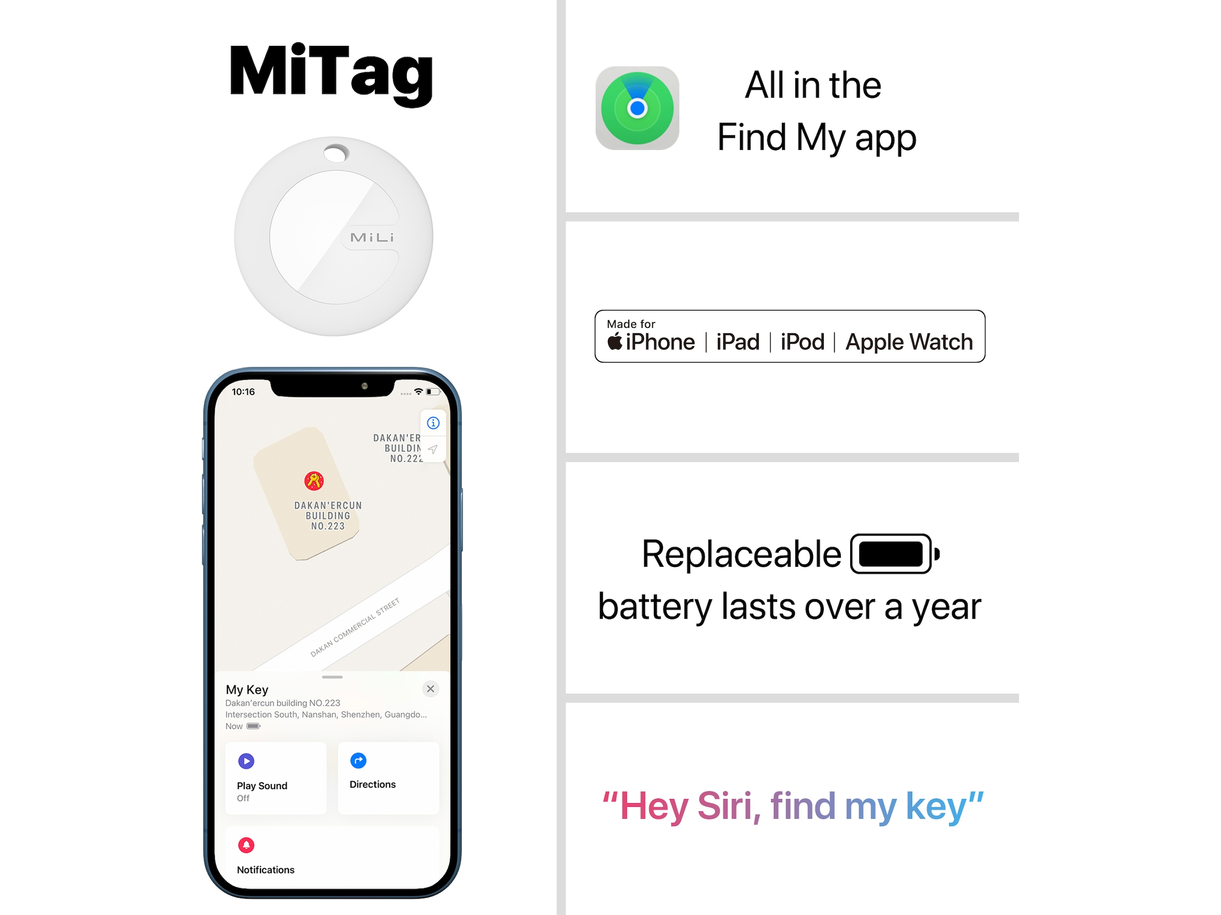 Hvis din MiTag-tracker er uden for Bluetooth-rækkevidde, men inden for rækkevidde af andre Apple-enheder, bruger den Apple Find My-netværket til at sende oplysninger om dens placering. Andre Apple-enheder i nærheden kan anonymt overføre Bluetooth-signaler forbundet med MiCollar, som derefter rapporteres til dig via "Find"-appen. Dette gør det muligt at finde den manglende MiTag selv over lange afstande.