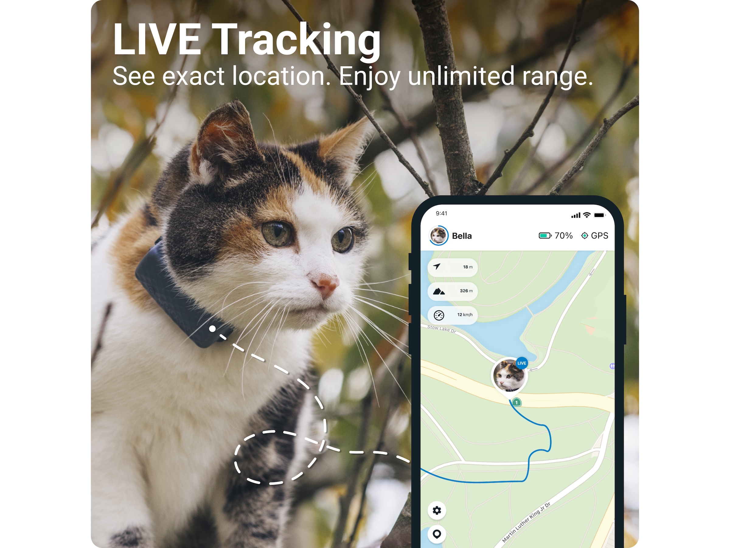 Følg hvert et skridt med placeringsopdateringer hvert 2.-3. sekund. Tractives GPS-tracker til katte bruger satellitteknologi, som giver dig mulighed for at tracke din kat overalt, uden at du behøver bekymre dig for, om den går for langt væk.
