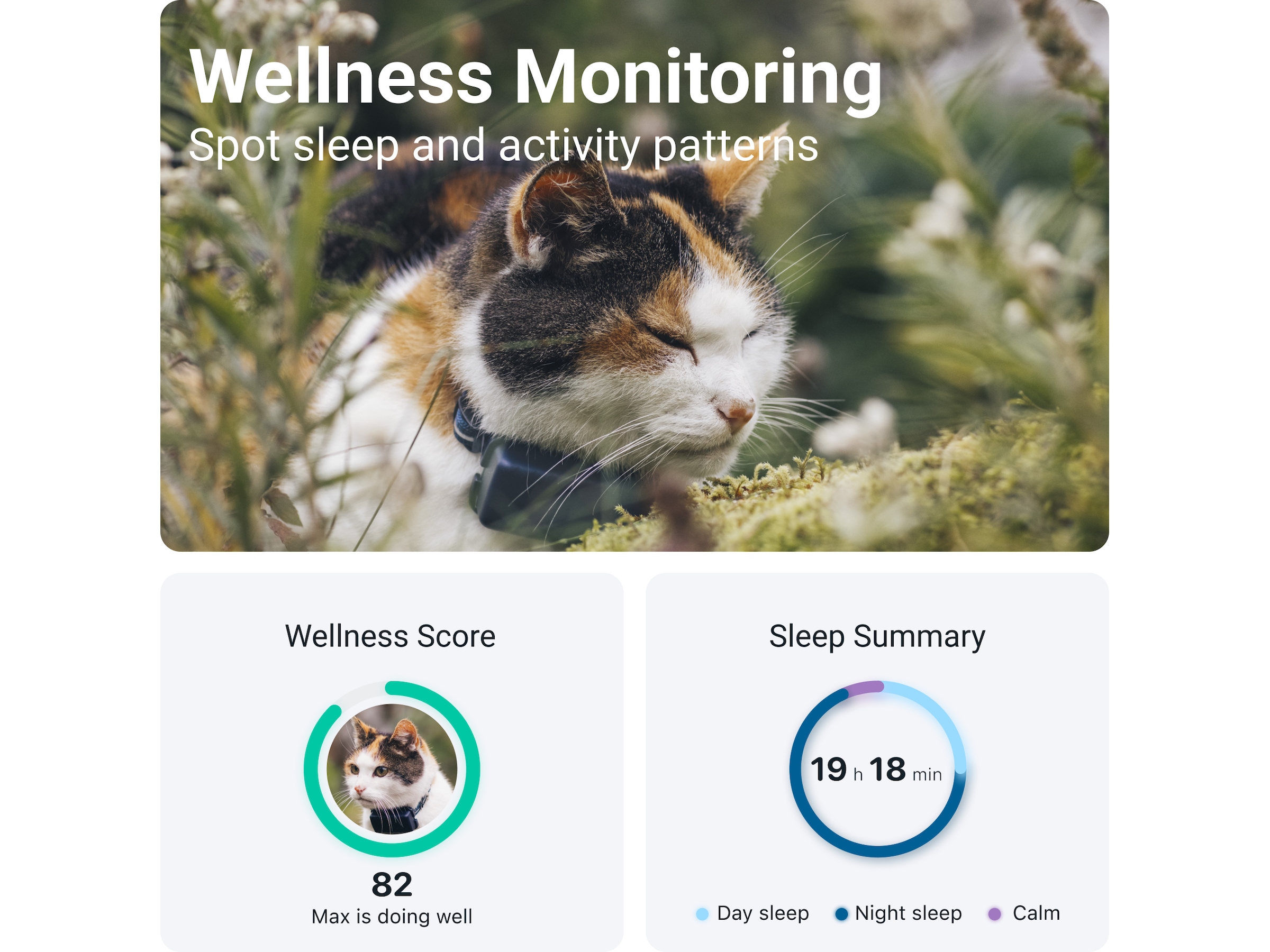 Hold øje med, at din kat er sund og rask. Se, hvor meget tid den bruger på at sove og bevæge sig. Opdag søvnmønstre. Sæt mål, se fremskridt, og sammenlign med andre.