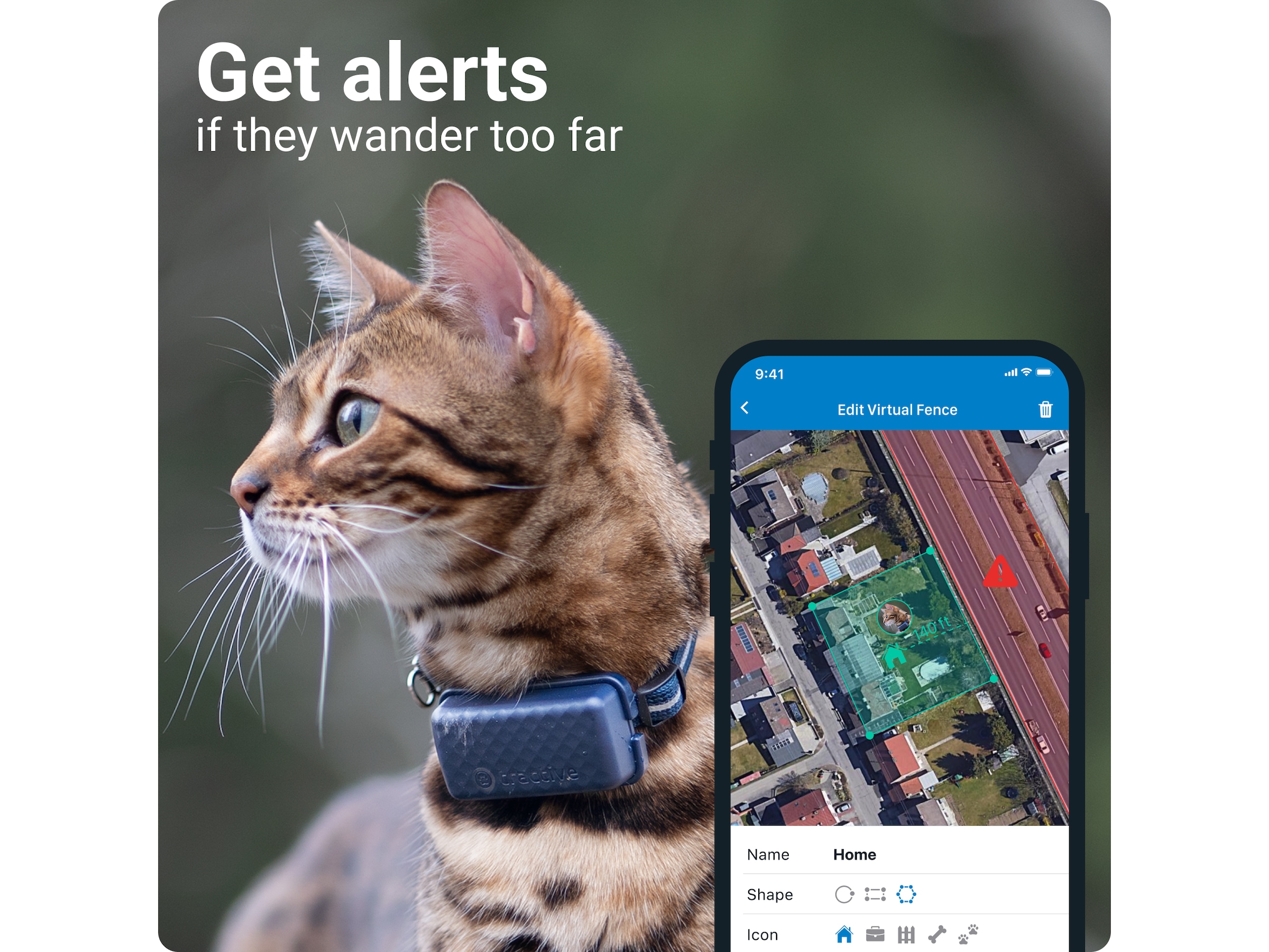 Opret sikre områder (f.eks. din have) og forbudte zoner, som din kat skal undgå (f.eks. en mark tæt på en trafikeret vej). Du får straks besked, hvis den går ind eller ud af et område.