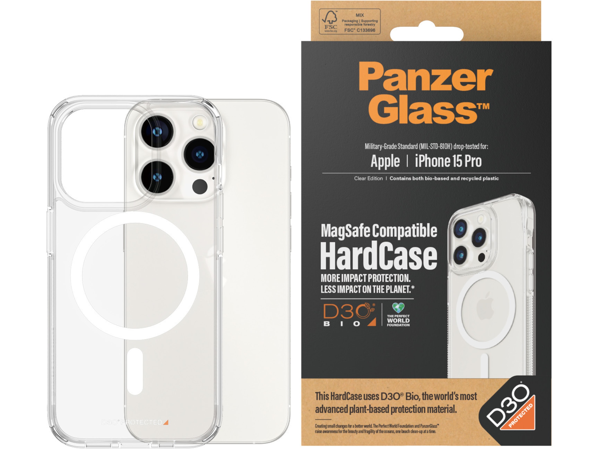 Vil du have mere beskyttelse mod stød med mindre påvirkning på planeten? Lavet med D3O® Bio, verdens mest avancerede plantebaserede beskyttelsesmateriale, der er tillid til at beskytte militære elitestyrker, denne PanzerGlass™ HardCase holder din telefon sikker mod fald, stød, ridser og det meste af hvad livet ellers måtte give dig. Bagsiden af kufferten er lavet af 100% genbrugsplast, stellet af plast med 44% plantebaseret indhold, og hele kufferten er faldtestet efter 3 x Military Grade Standard. Det betyder, at den kan modstå adskillige fald fra en højde på 3,6 meter eller en sidde-på-altan-og-tilfældigvis-tappe-din-telefon slags højde.