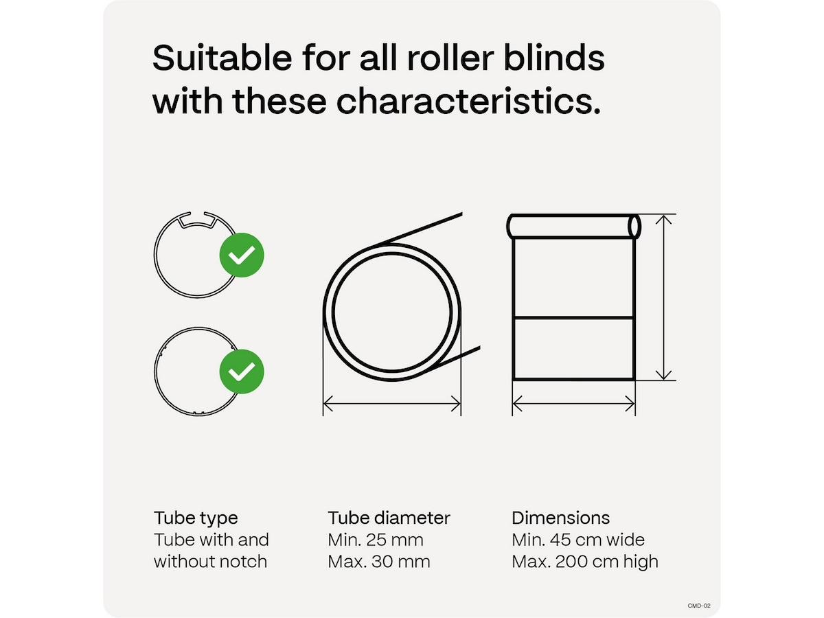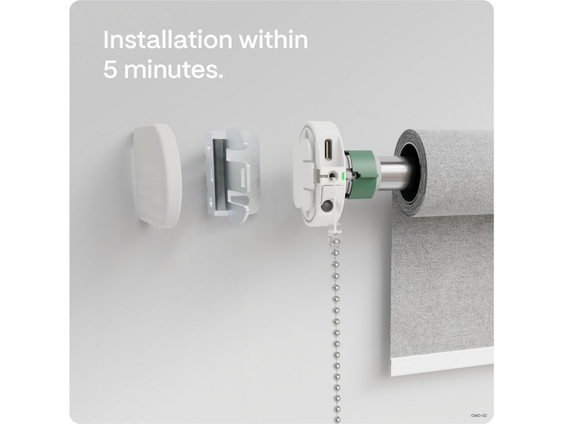MotionBlinds eftermonteringsmotoren til rullegardiner er nem at installere i dine eksisterende rullegardiner. En justerbar adapter i den roterende ende af motoren klemmer sig automatisk fast i røret og driver persiennen. Den trådløse motor har et integreret batteri, der kræver genopladning en eller to gange om året ved hjælp af et USB-C-kabel.