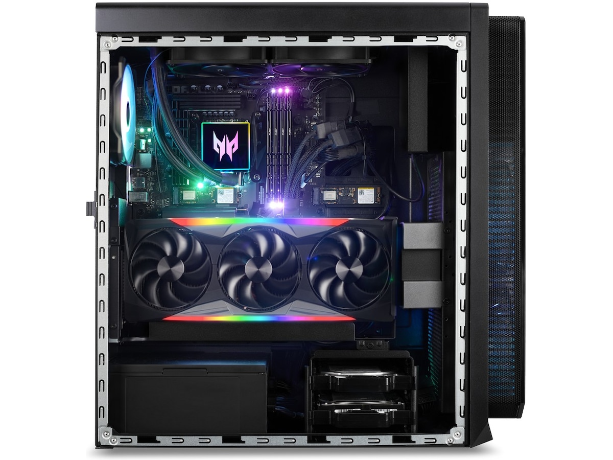 Hold opdateringsfrekvensen høj og temperaturen lav med de nye ARGB-udstyrede Predator FrostBlade™ 2.0 blæsere, eller kast et blik ind i pc’ens skyggefulde indre for at få et glimt af vores seneste AIO CPU-væskekøler i aktion. Computeren indeholder branchens bedste komponenter, og der er ikke skortet på midler for at holde temperaturer og støjniveauer lave.