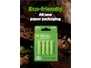 Et NiMH genopladeligt AA-batteri med miljøvenlige egenskaber, med mindre påvirkning på miljøet såvel som din pengepung. Med en driftstemperatur fra -20 °C til +50 °C giver den pålidelig ydeevne selv i ekstreme miljøer. Batteriet er lavet af mere end 10 % genbrugsmaterialer og 94 %+ af hele batteripakken, inklusive æsken, kan genbruges.