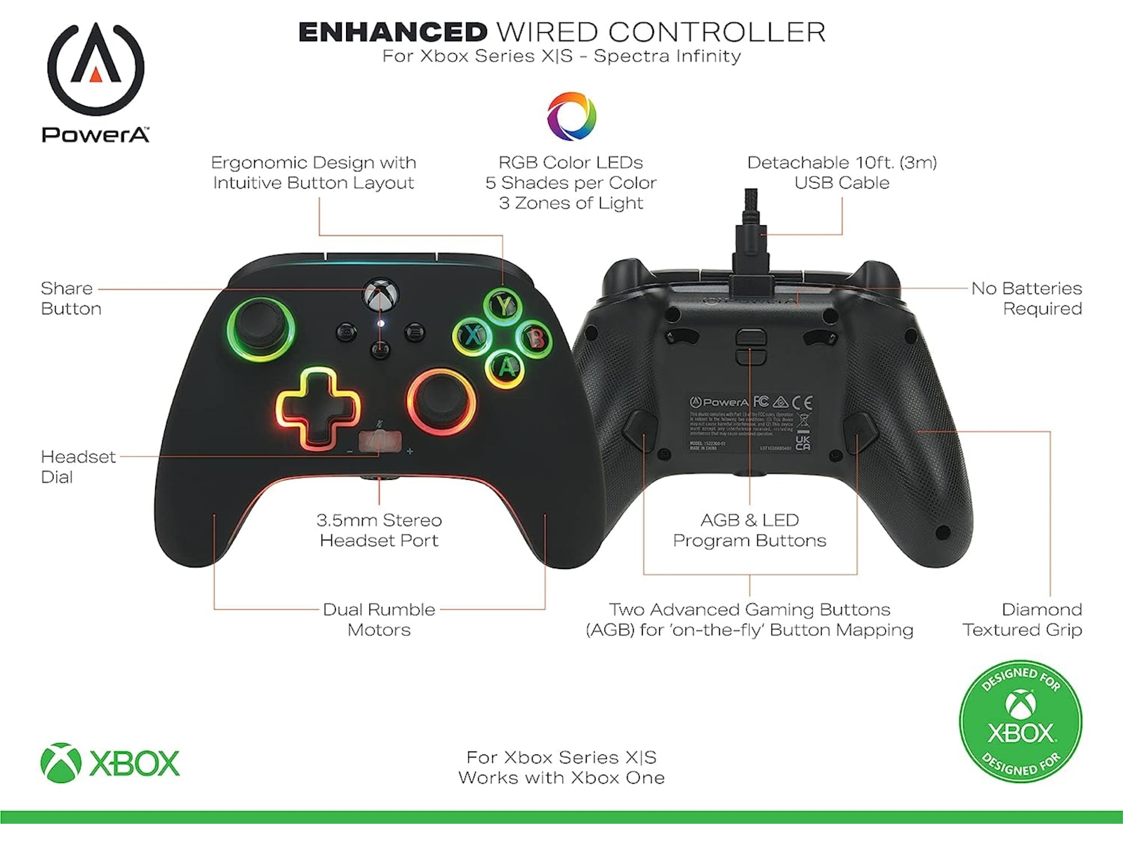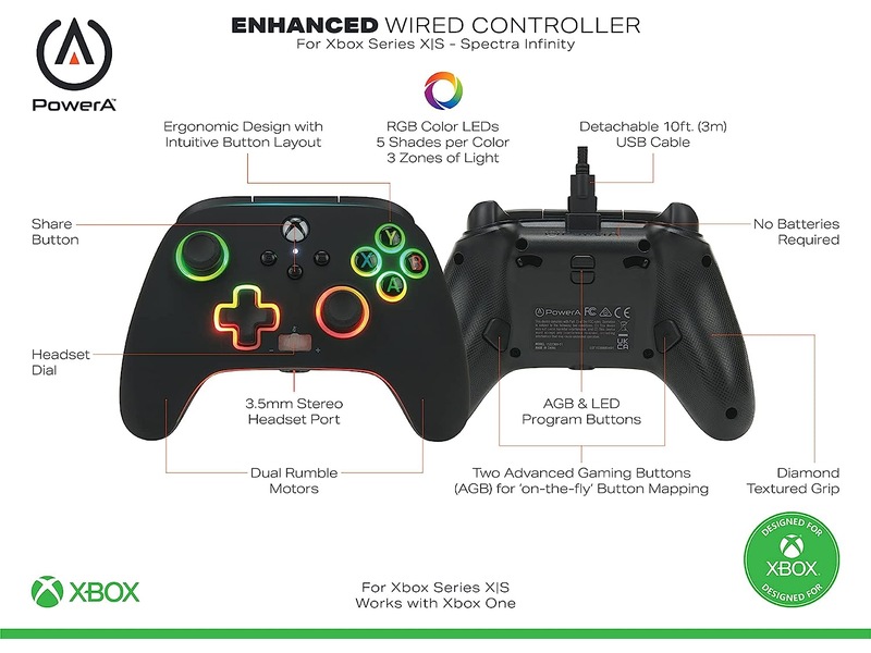 Spectra Infinity Enhanced Wired Controller til Xbox Series X|S har alt, hvad du behøver. Med Xbox Share-knappen, en volumenvælger med et-touch Mic Mute, to indlejrede anti-friktionsringe og et 3,5 mm lydstik, vil du nyde en komplet spiloplevelse. Krystalklar stereolyd og intuitive kontroller gør kommunikation i spillet til en leg. Spil fra hvor som helst i rummet med det flettede 10-fods kabel med et snap-lock-stik og inline-udløser.