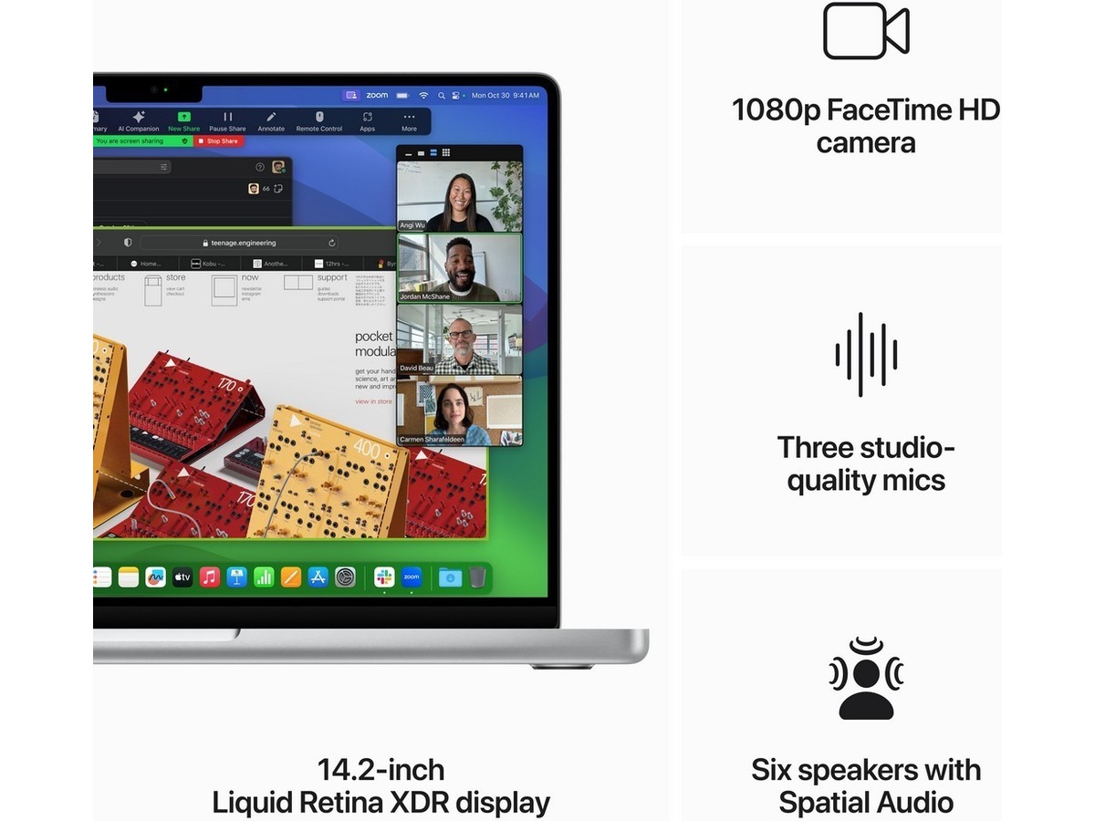 - BRILLIANT PRO DISPLAY – Den 14,2-tommer Liquid Retina XDR-skærm(3) har Extreme Dynamic Range, 1000 nit kontinuerlig lysstyrke for imponerende HDR-indhold, op til 600 nit lysstyrke for SDR-indhold og professionelle referencetilstande, såsom at du kan få jobbet gjort på farten.