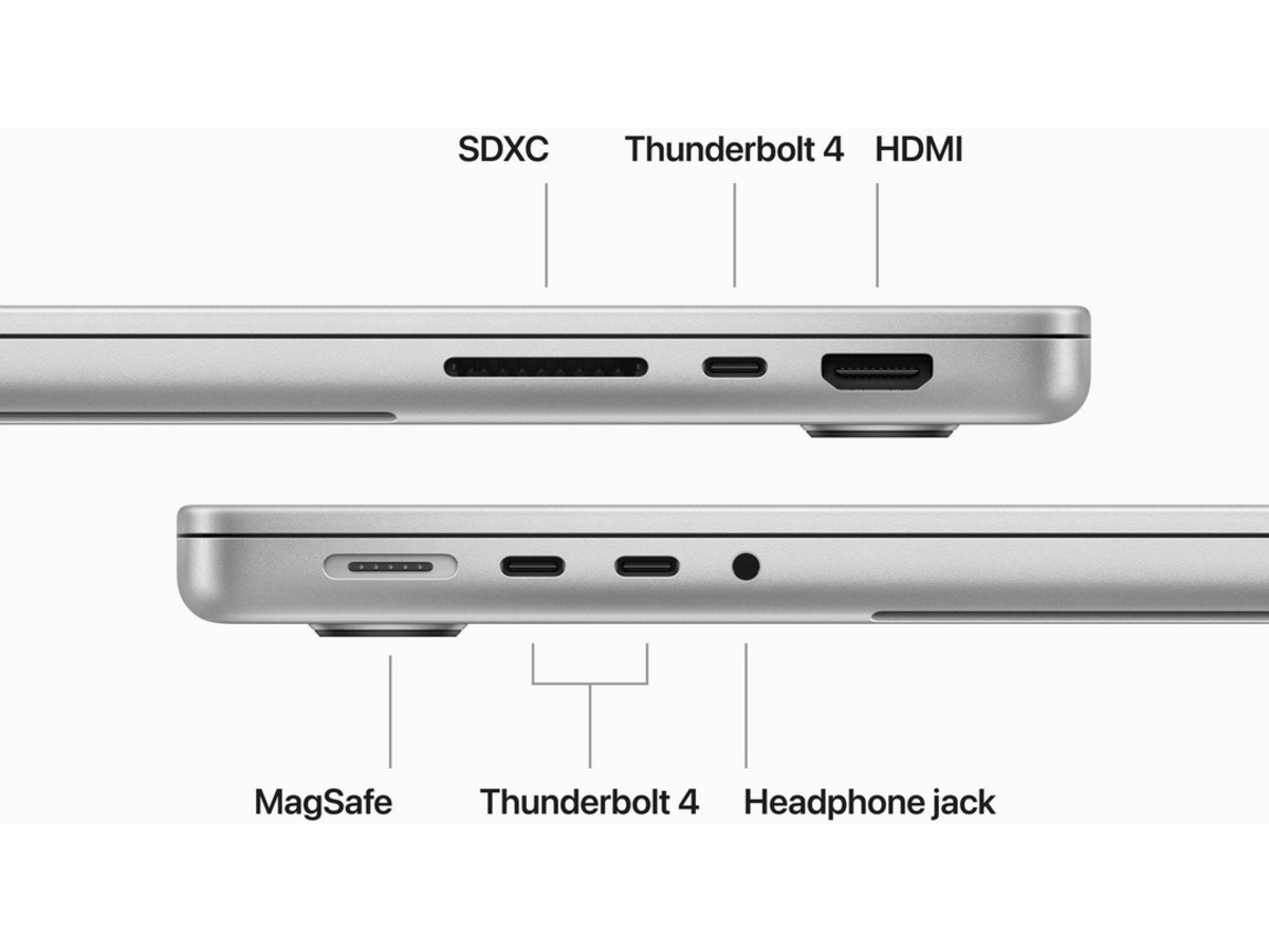 - TILSLUT TIL ALT – Denne MacBook Pro har en MagSafe-opladningsport, tre Thunderbolt 4-porte, en SDXC-kortport, en HDMI-port og et hovedtelefonstik. Få hurtig trådløs forbindelse med WiFi 6E (5) og Bluetooth 5.3. Og du kan tilslutte op til to eksterne skærme med M3 Pro eller op til fire med M3 Max.