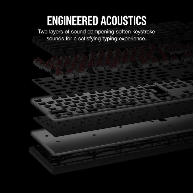 Forsmurte CORSAIR Red lineære mekaniske kontakter leverer jævne, responsive tastetryk, forstærket af to lag lyddæmpning for ekstremt tilfredsstillende spil og skrivning.