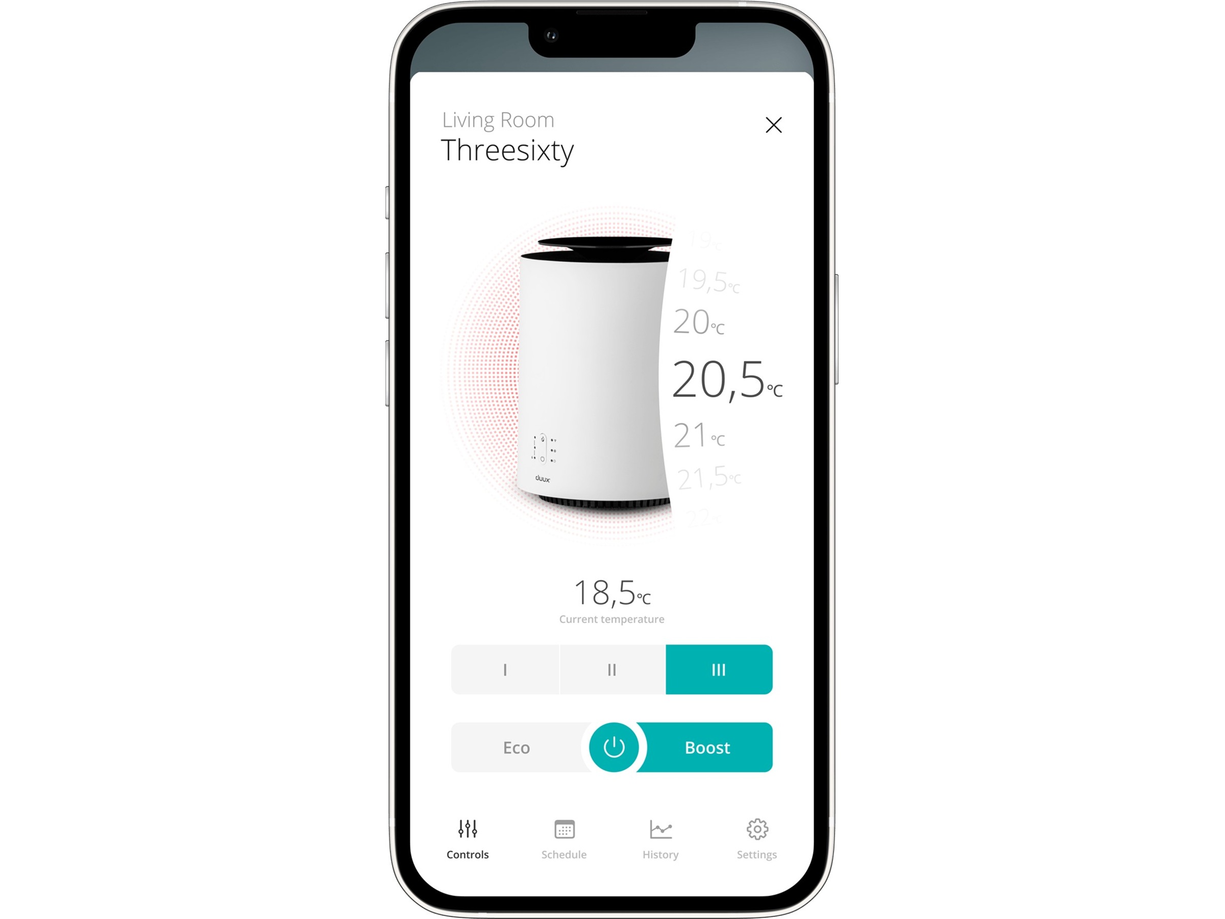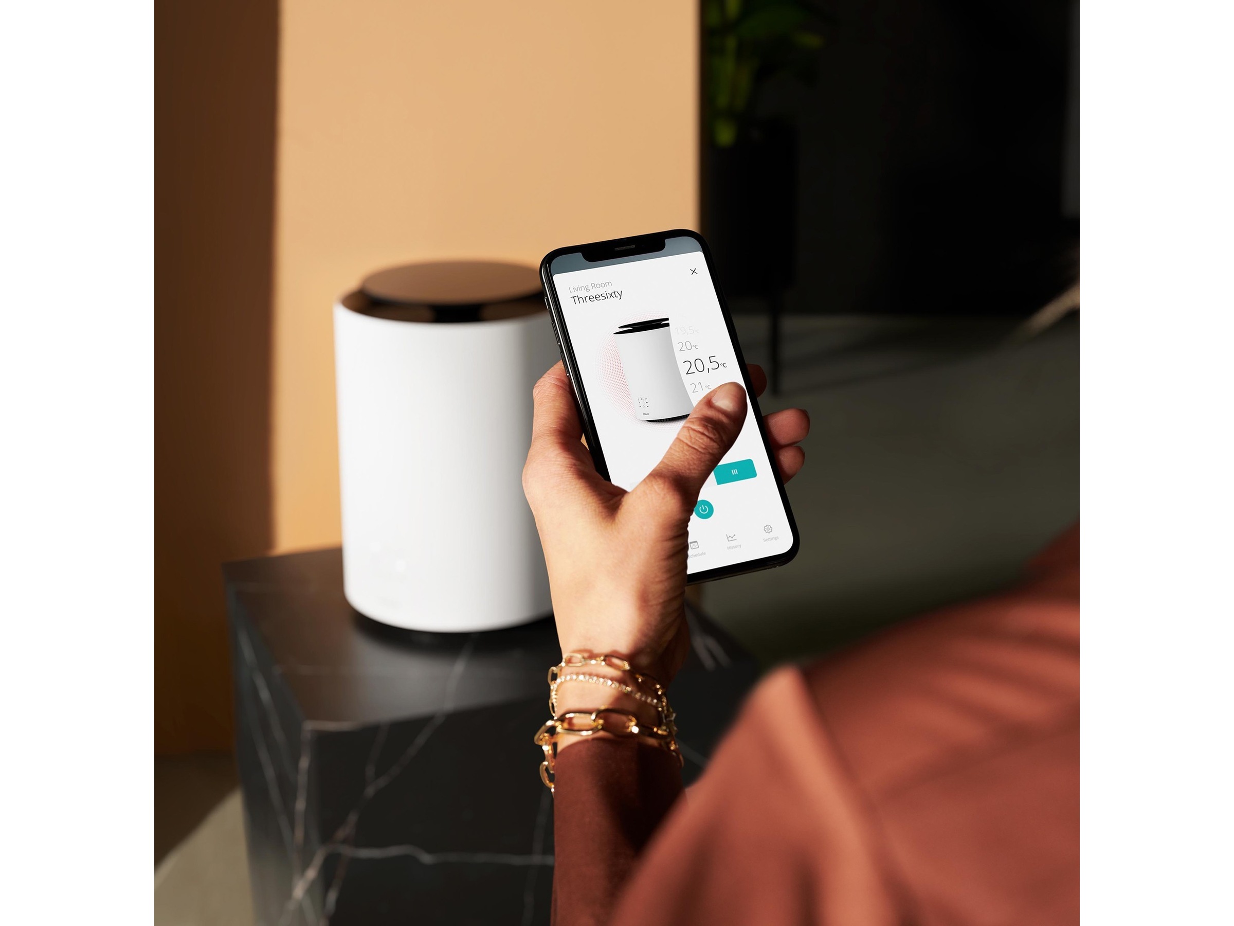 Med 3 varmeindstillinger (maks. 1.800 watt) og 2 ventilationsindstillinger (øko og boost) er Threesixty 2 et alsidigt varmelegeme. I boost-tilstand kan den opvarme et rum på 30 m2 dobbelt så hurtigt som konventionelle varmelegemer, takket være dets effektive PTC-varmeelement. Luftudtaget sørger for, at varmen fordeles jævnt i 360 grader.