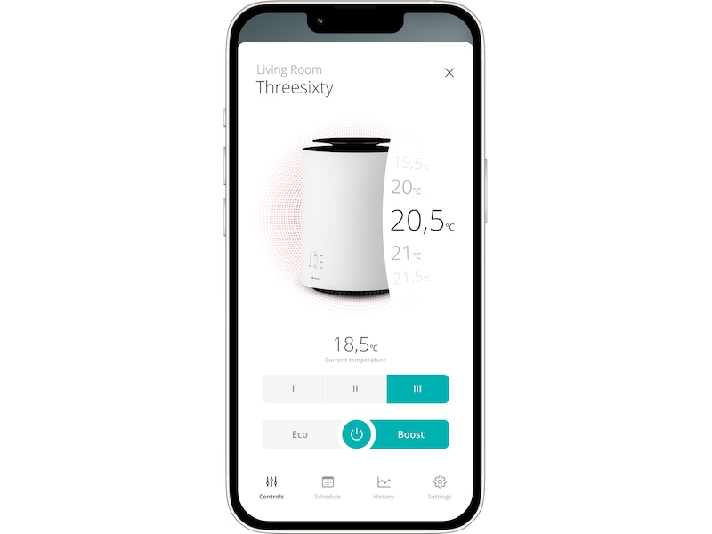Med 3 varmeindstillinger (maks. 1.800 watt) og 2 ventilationsindstillinger (øko og boost) er Threesixty 2 et alsidigt varmelegeme. I boost-tilstand kan den opvarme et rum på 30 m2 dobbelt så hurtigt som konventionelle varmelegemer, takket være dets effektive PTC-varmeelement. Luftudtaget sørger for, at varmen fordeles jævnt i 360 grader.