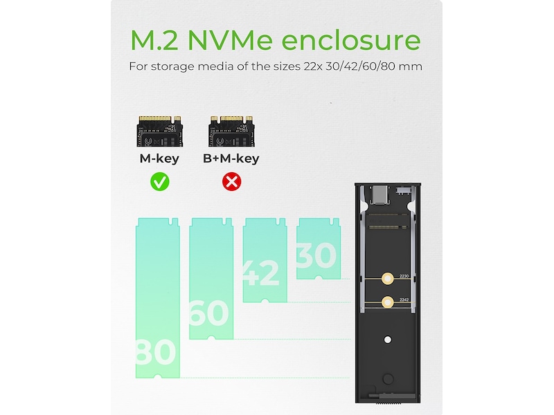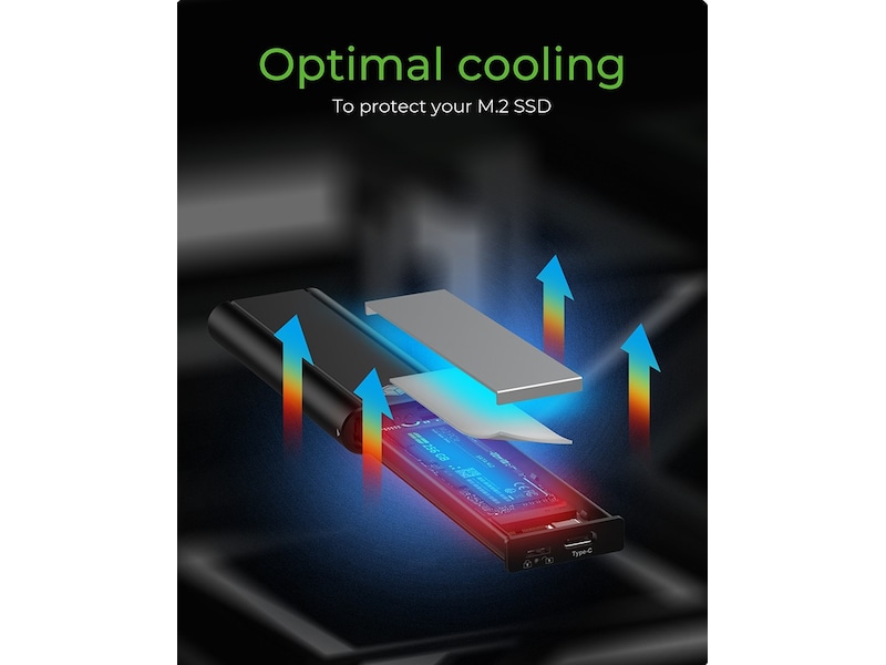 Med IB-1807MT-C31 pakker du dit NVMe-lager ind i sort aluminium. Dette er ikke kun smart, men også robust. Derudover køler højkvalitetsaluminium din opbevaring. M.2 NVMe SSD'er i de almindelige størrelser fra 2230 til 2280.
