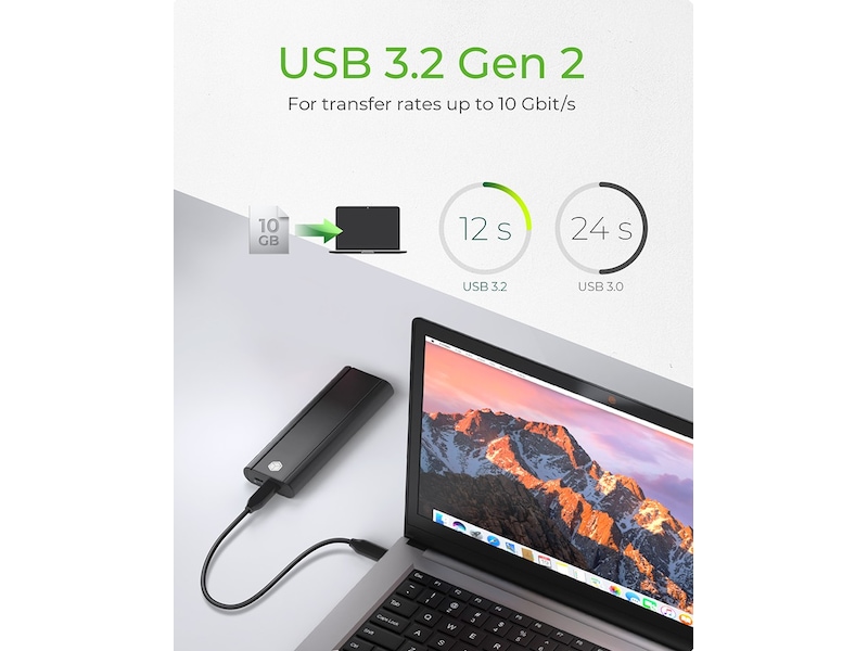 IB-1807MT-C31 er et eksternt kabinet til M.2 NVMe SSD'er. Dit opbevaringsmedie finder en sikker plads i det robuste hus af højkvalitetsaluminium - uden brug af værktøj. Aluminiumet sikrer også optimal køling af SSD'en. USB 3.2 (Gen 2) sikrer hurtig dataoverførsel med op til 10 Gbit/s. Det matchende USB Type-C-kabel med Type-A-adapter medfølger i leveringsomfanget. Det højkvalitets aluminiumshus rummer SSD'er i alle almindelige M.2-formfaktorer: fra 2230 til 2242 og 2260 til 2280.