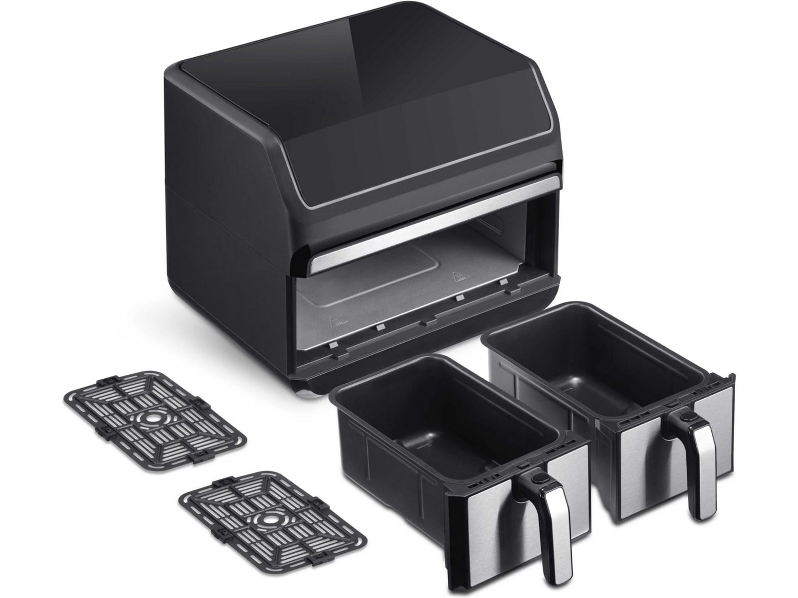 Denne frituregryde er udstyret med to kurve, der gør det nemt at tilberede to forskellige retter på samme tid, hver med individuelle temperatur- og tidsindstillinger.