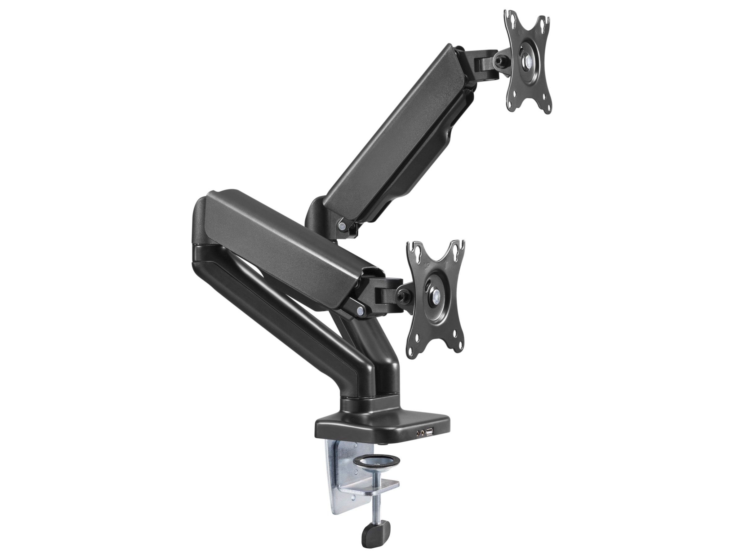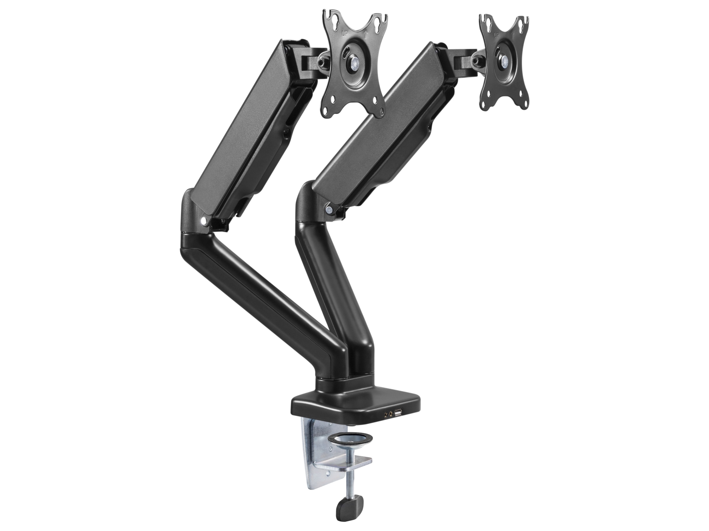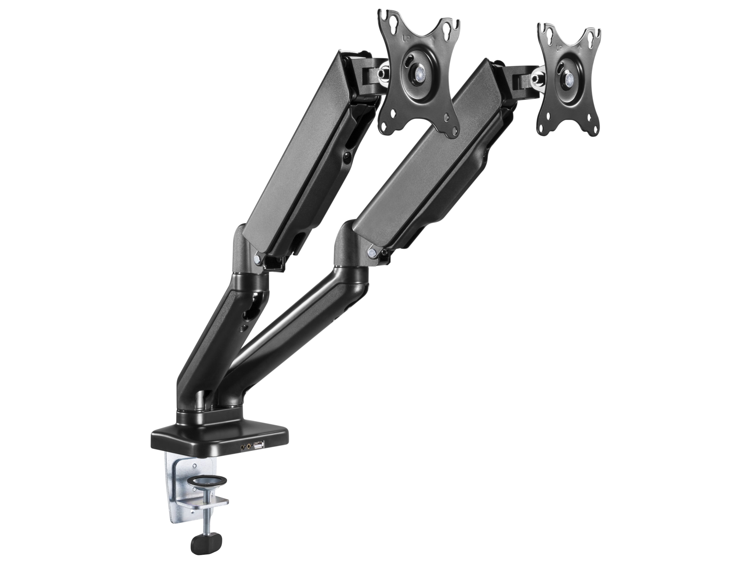 Monitorarmene er udstyret med en gasfjeder og tilbyder en række justeringsmuligheder for at reducere nakke- og øjentræthed og finde en behagelig arbejdsstilling. Du kan rotere hver skærm op til 180 grader i begge retninger, svinge dem op til 90 grader til hver side og vippe dem op til 90 grader op eller ned. Uanset om du har flade eller buede skærme, passer denne monitorarm til begge typer.