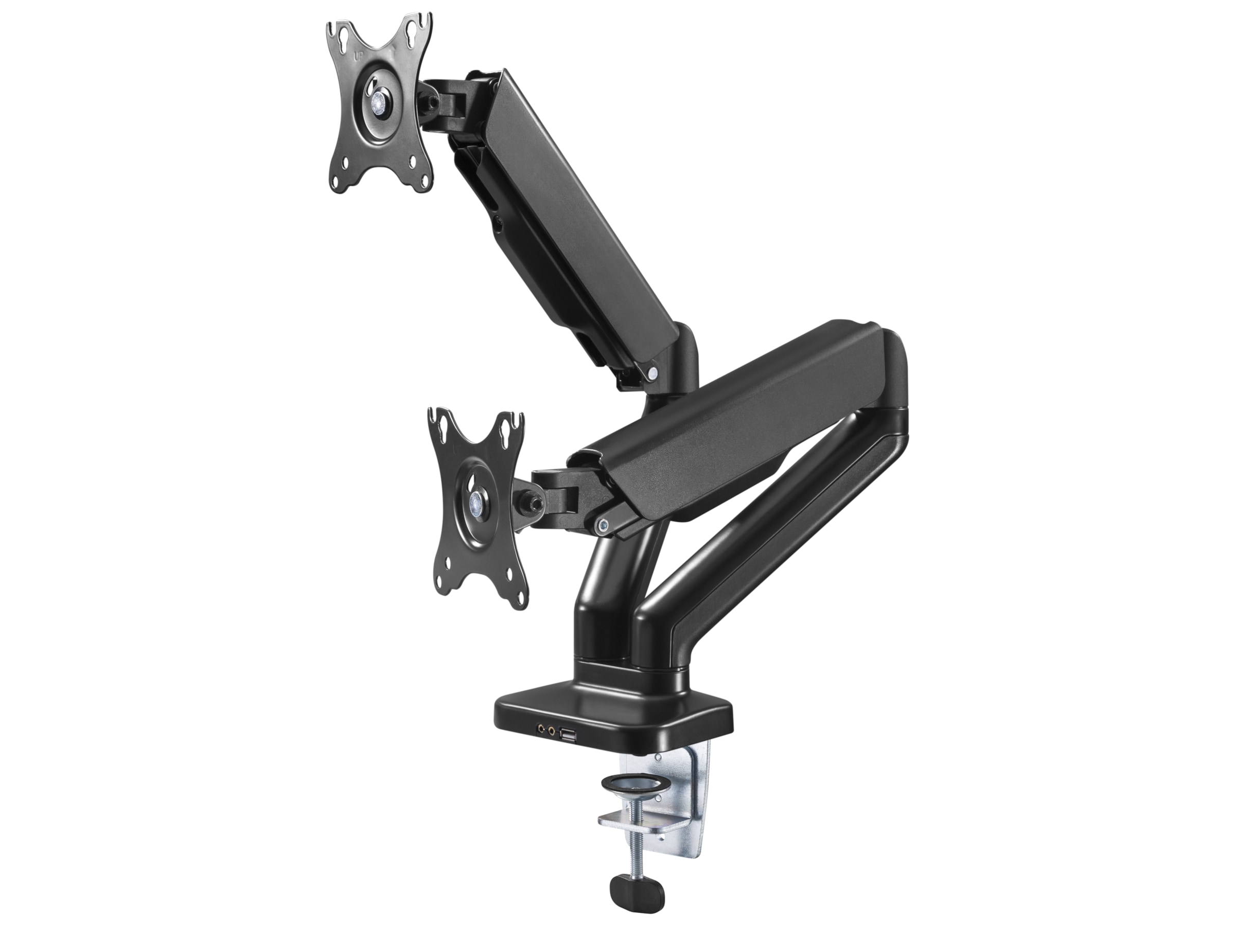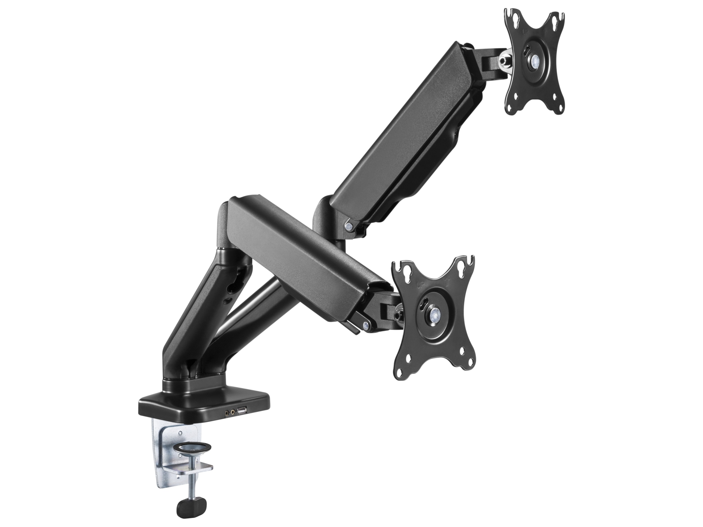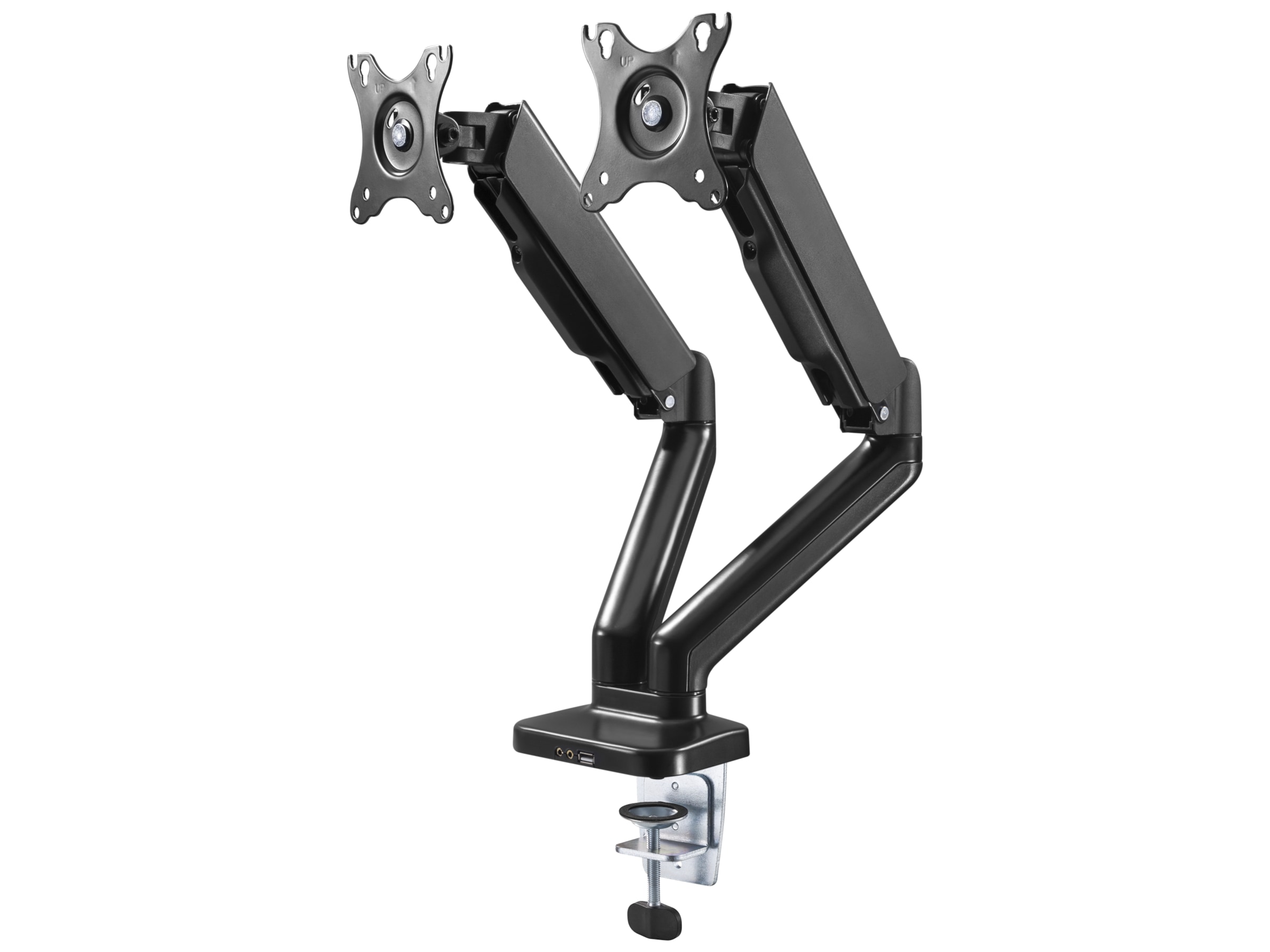 Monitorarmene er udstyret med en gasfjeder og tilbyder en række justeringsmuligheder for at reducere nakke- og øjentræthed og finde en behagelig arbejdsstilling. Du kan rotere hver skærm op til 180 grader i begge retninger, svinge dem op til 90 grader til hver side og vippe dem op til 90 grader op eller ned. Uanset om du har flade eller buede skærme, passer denne monitorarm til begge typer.