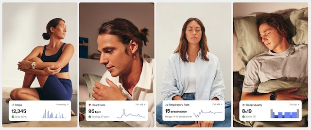 Sporingsdata Cyklus, Søvnkvalitetsscore, Kalorier forbrændt, Hjertefrekvens under søvn, Stemning, Distance, åndedrætsfrekvens, Søvnaktivitet, Menstruationscyklus, Hævning, Aktiv tid, Trin taget, Hjertefrekvens, Hjertefrekvensvariabilitet, Hastighed