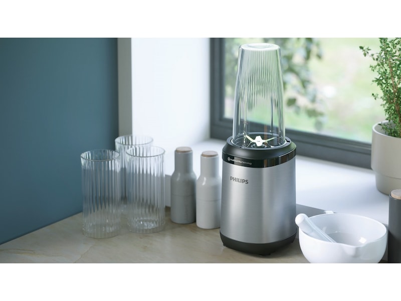 Berig dine kulinariske færdigheder med blenderen fra Philips i 5000-serien. Nyd de glatteste blandinger selv fra opskrifter med frosne frugter, isterninger og nødder. Elegant design til køkkenbordet. Aftagelige dele, der kan vaskes i opvaskemaskinen for nem rengøring.