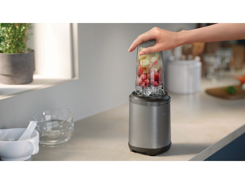 Bland og tag med dig i den praktiske 700 ml beholder. Lav din daglige smoothie, og sæt derefter et lækagesikkert låg på for at tage den med dig. Opbevar den i køleskabet til senere. Beholderen er lavet med Tritan fra Eastman, den er 100% BPA fri, brudsikker og tåler opvaskemaskine.
