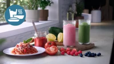 Oplev en verden af lækre opskrifter! Udforsk vores NutriU-app for velsmagende drinks, supper, saucer og mere, plus tips og tricks til at bruge din blender.