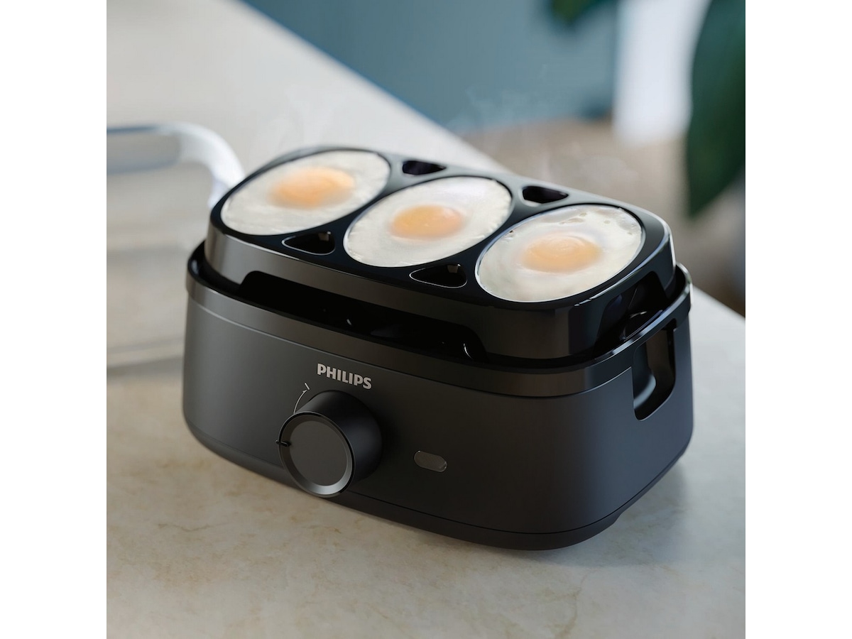 Æggekogeren leveres med tilbehørsbakke til pocherede æg. Den er nem at bruge og rengøre; læg bare på bakken for at lave 3 velsmagende pocherede æg på én gang.