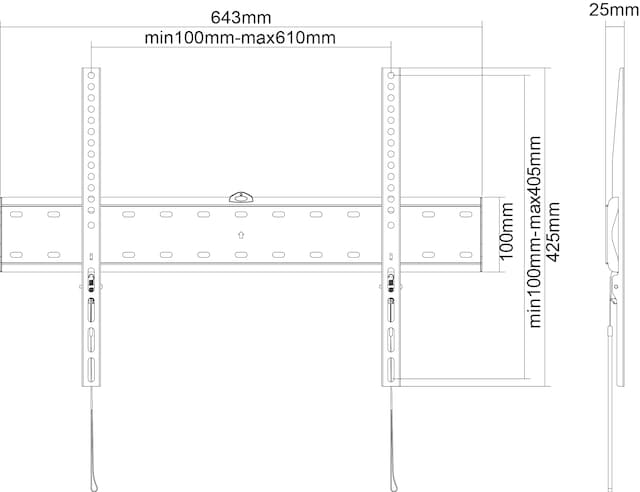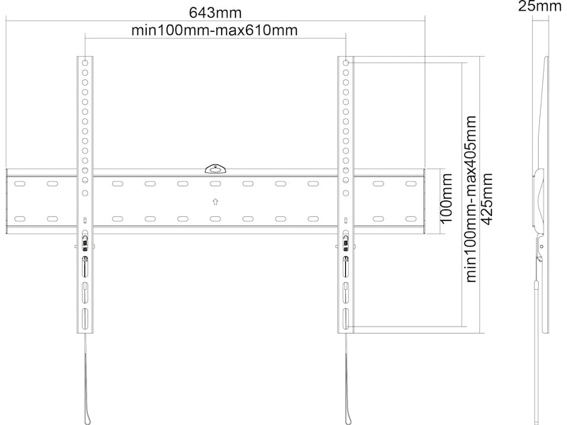 Beslaget bygger kun 25 mm ud fra væggen, hvilket sikrer, at din TV hænger meget tæt på væggen for at smelte bedre ind i omgivelserne. Snorene, der er skjult bag TV'en, er til en smart fjederlås, der gør det let at låse op, hvis du skal løfte TV'en ned fra væggen.