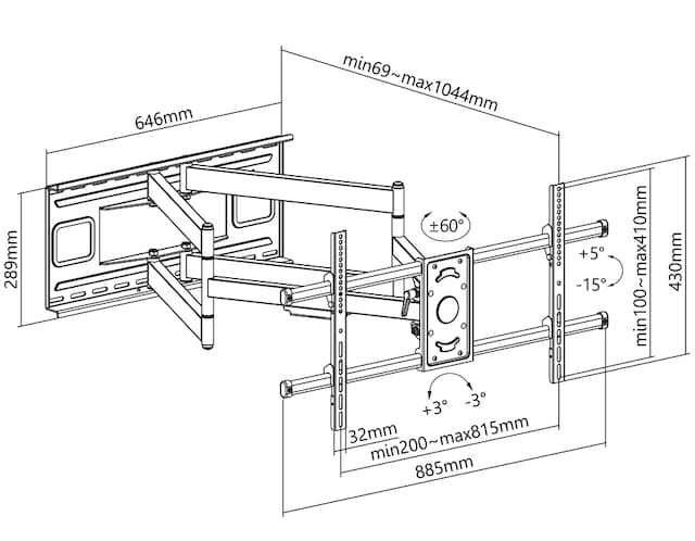 Den justerbare arm gør det muligt at forlænge din TV op til 1044 mm fra væggen, mens den indfældede arm reducerer afstanden til kun 69 mm fra væggen, hvilket gør din TV bedre integreret i omgivelserne.