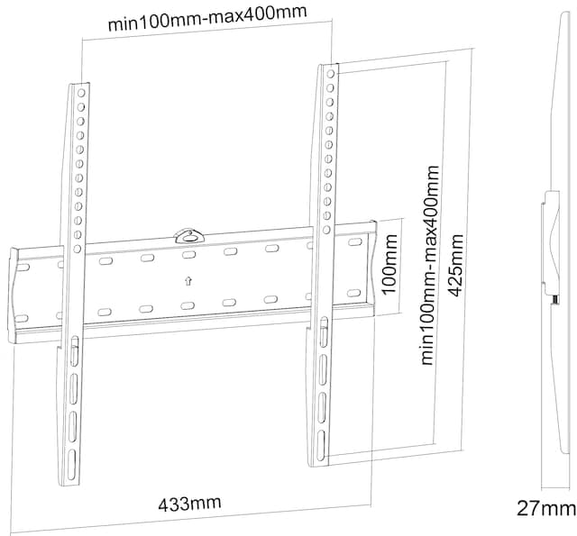 Dette vægbeslag er kompatibelt med VESA-standarden op til 400x400. Informationen om, hvilken VESA-standard din TV har, findes i TV'ens manual eller ved at måle afstanden mellem hullerne på bagsiden.